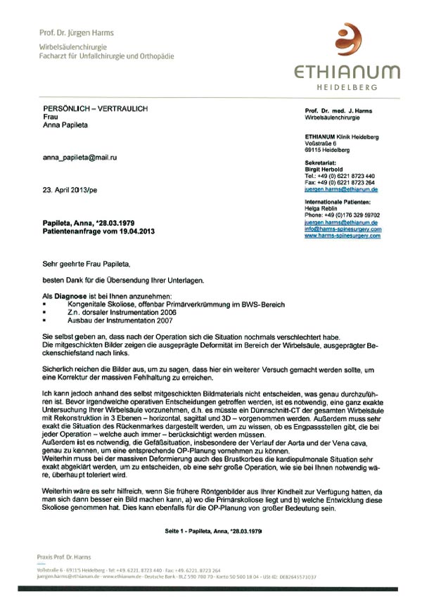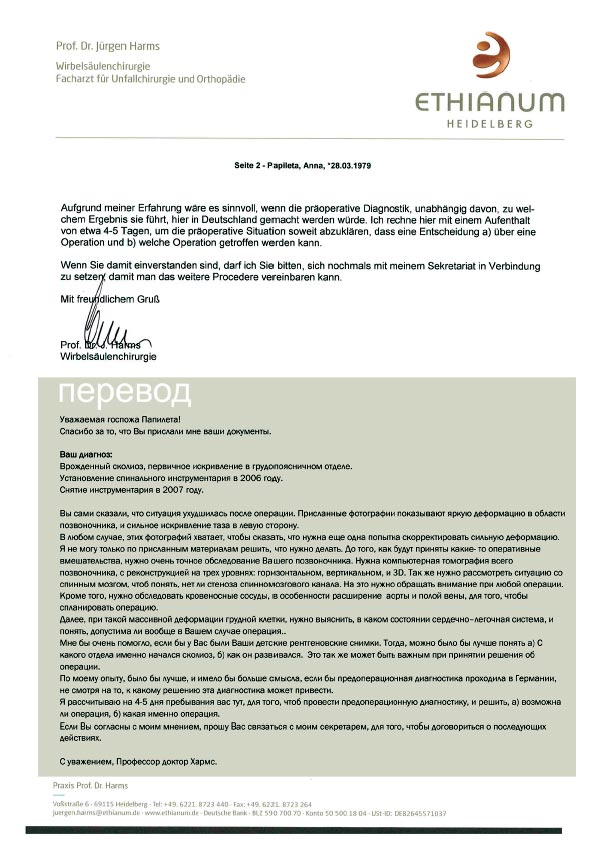 Он признан экспертом в области хирургии позвоночника во всем мире. Этот профессор, имеет большой опыт работы, он провел более 10 тысяч операций, а главное, у него большой опыт со сложными случаями подобными моему, более половины проводимых доктором Хармсом операций – это ревизии неудачных последствий операций.