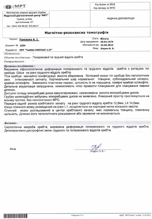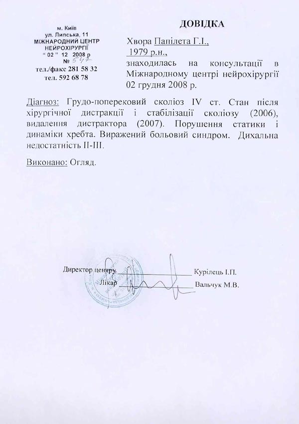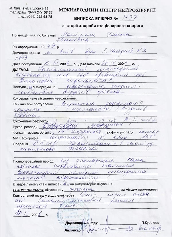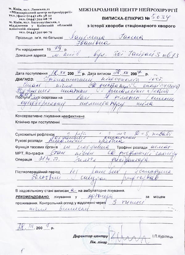 Все мотивировали отказ тем, что у меня очень сложный случай, да еще и уже однажды оперированный, а это все усложняет. Объясняют, что после операции, на позвоночнике сформировался костный блок, и разделять его теми методами, что доступны в наших институтах, очень опасно. Высока вероятность парализации.