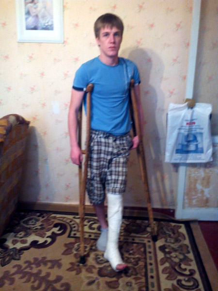На данный момент Сергей передвигается с помощью костылей. Хоть ногу и удалось спасти, опираться на нее пока нельзя, так как удален немалый участок кости. Для того, чтобы Сергей смог ходить без костылей, ему нужна еще одна операция, во время которой удаленный участок кости заменят специальным каркасным материалом (стоимостью 17500 грн.) и молодыми клетками, из которых должна вырасти здоровая кость. Если операцию не сделать, ходить без костылей, опираться на ногу Сергей не сможет, над ним будет постоянно висеть риск перелома. Собственно, недавно от опоры на ногу кость треснула и сейчас Сергей в гипсе. Без операции такие ситуации будут повторяться снова и снова.