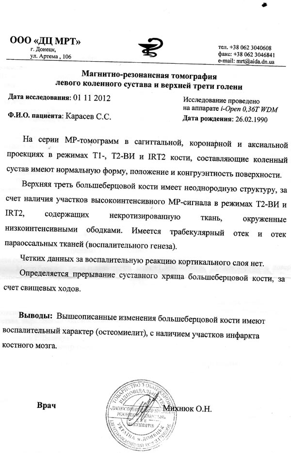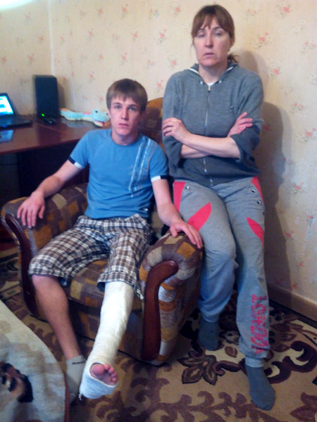 В 2012 году сын работал в Тамбове. После обращения за медицинской помощью (вырезан карбункул) началось заражение крови с осложнением на левую ногу. В тяжелом состоянии сын вернулся домой. Последовала госпитализация и страшный диагноз – абсцесс и остиомиелит берцовой кости левой ноги. Вызвали врача из Донецка. Сергею грозила ампутация левой ноги, но опытный врач пообещал спасти ногу. Мы пережили долгие дни и месяцы реанимации, было потрачено около 30 тысяч гривен. Шла тяжелая борьба за ногу сына и за саму его жизнь. Затем следовали операция за операцией (всего было перенесено 5 операций), в результате которых удалось спасти Сережу и его ногу.
