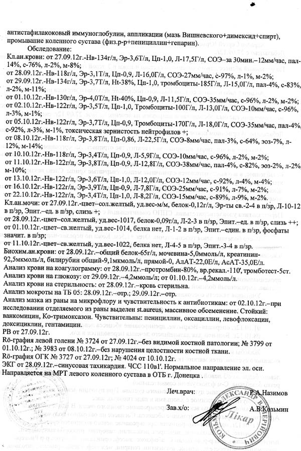 Диагноз: Травма ноги, сепсис (заражение крови), подколенный абсцесс коленного сустава и кожи верхней трети голени.