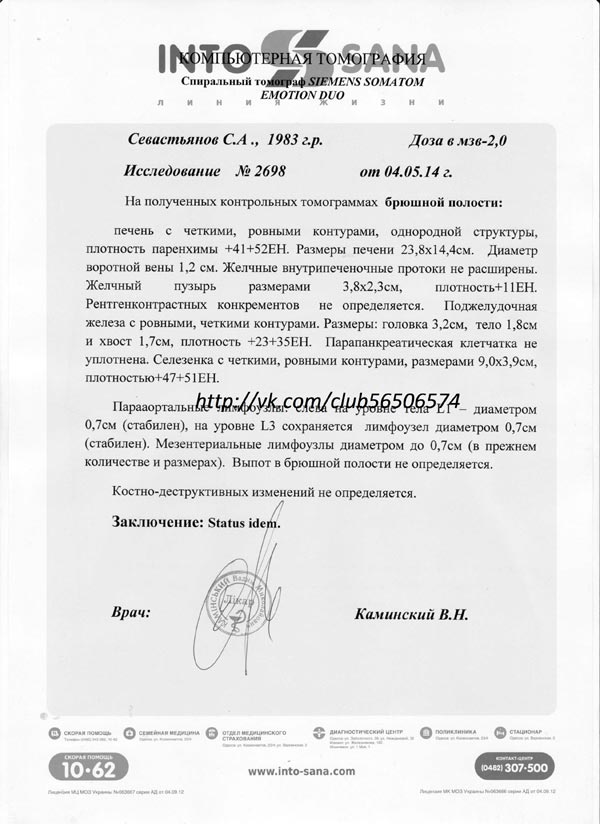 04.05.14 мы ездили в Одессу на томографию. Так вот, по результатам томографии внутренние органы у Серёжи без патологических изменений и в пределах нормы. Доктор сказал, что "картинка стабильная", лимфоузлы остаются в прежних количествах и размерах. Все это означает, что Сережа не напрасно принимает "Гливек", который помогает сдерживать количество "плохих" клеток и не дает им распространяться.