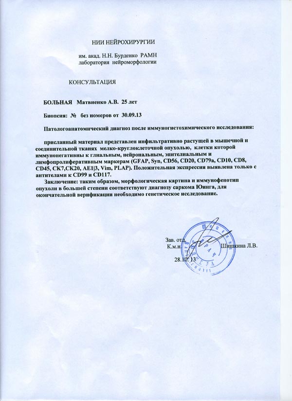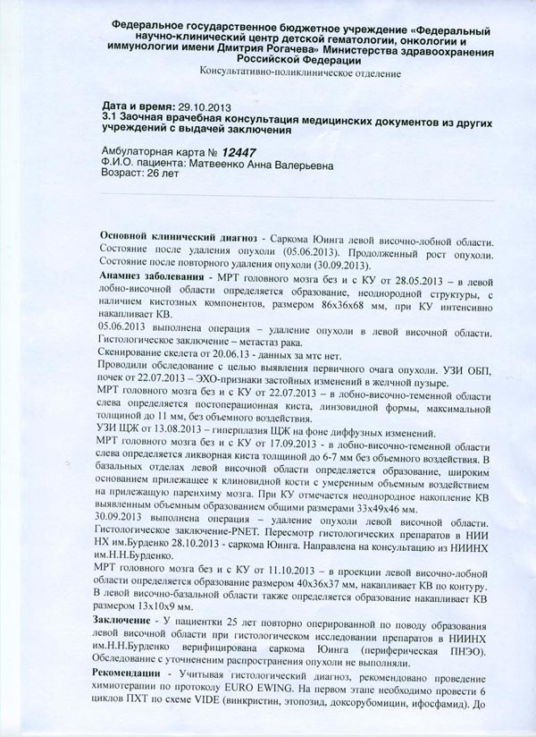 Спустя 4 месяца после операции, у Ани возникла отёчность, очередное МРТ показало наличие новообразованного очага в левой височной области. Была проведена вторая операция, в том же Киеве. Но при обследовании на МРТ через месяц вновь обнаружили очаг. Для дальнейшей постановки диагноза Аня с мужем обратились в Москву, где ей установили диагноз - "саркома Юинга", а так же дали рекомендации по лечению.