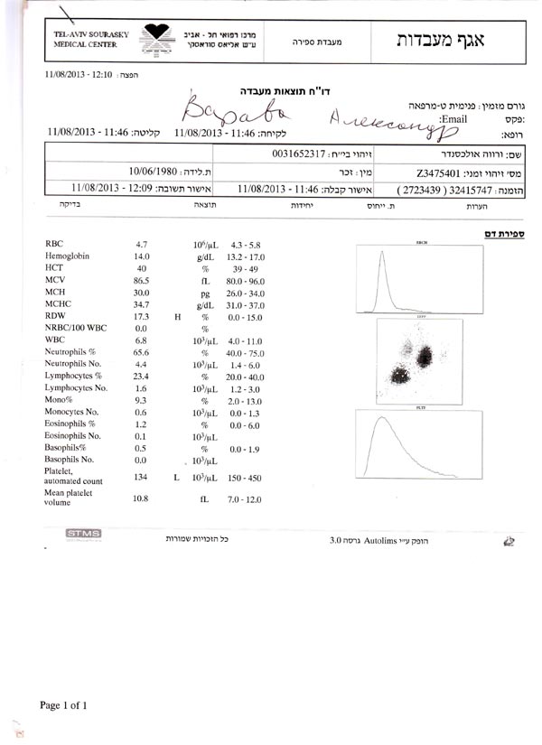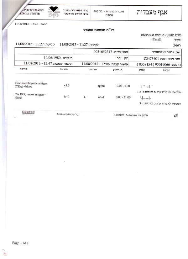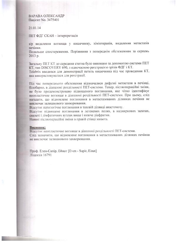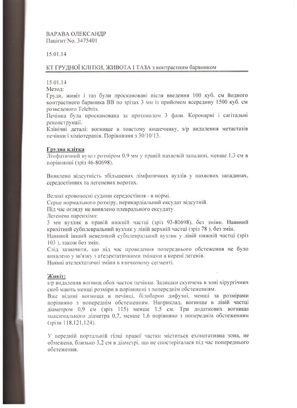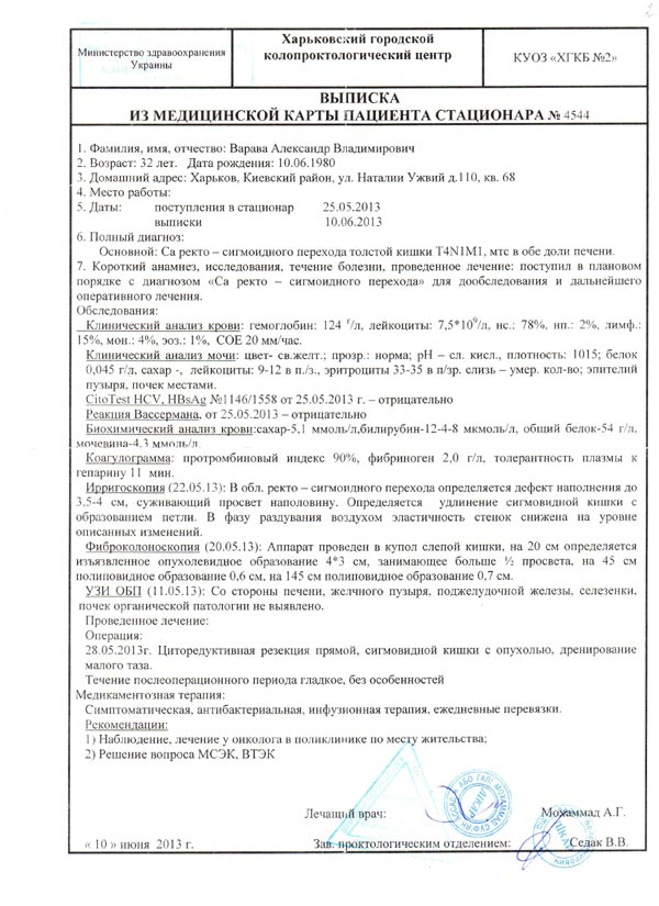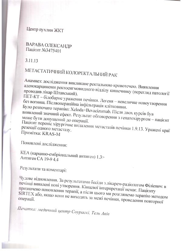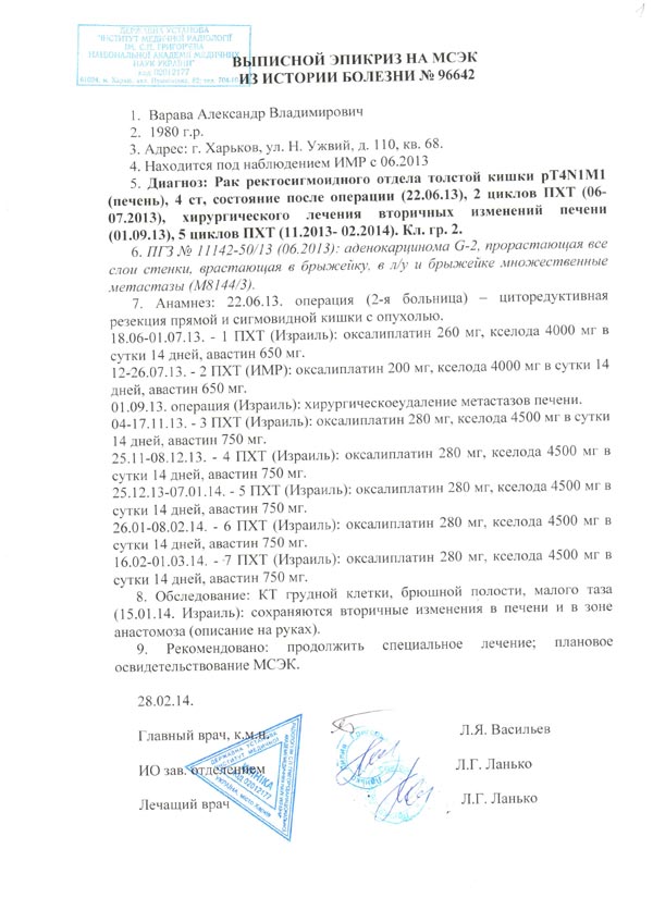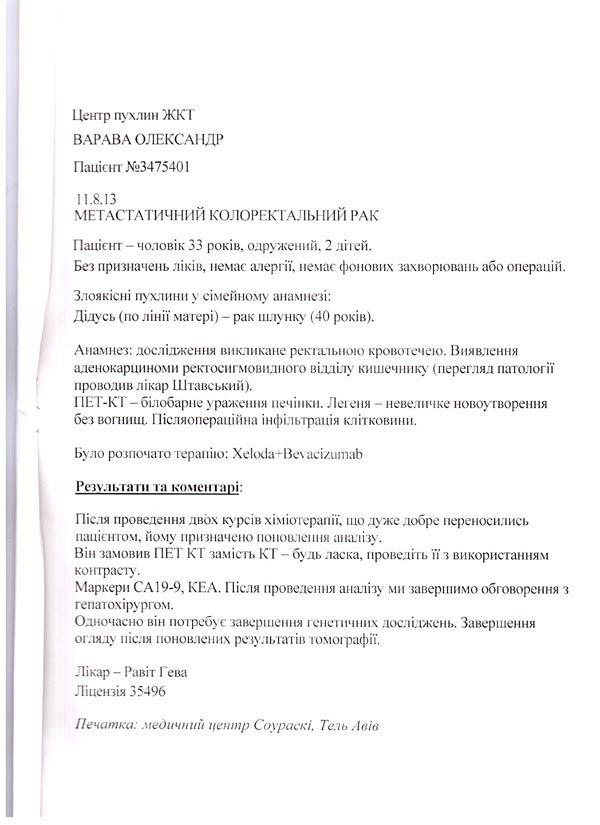 Александру необходимо пройти лечение с помощью химиотерапий после операции по удалению метастазов в печени. Александр уже перенес две операции. Первая операция состоялась 25.05.2013 г. в г.Харьков, в результате которой удалили опухоль толстой кишки, но, к сожалению, выявили метастазы в печени. Врачами был вынесен жестокий вердикт: шансов выжить у Александра нет. Несмотря на это, Александр и его семья не опустили руки. Вторая операция была проведена в Израиле 01.09.2013 г. Врачи удалили все метастазы, а вместе с ними и большую часть печени. После операции было назначено лечение с помощью химиотерапий. Александр уже прошел 9 курсов химиотерапии с помощью препарата Авастин (один сеанс стоит 5500 у.е.).