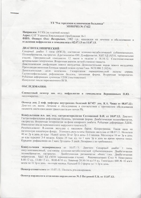 На сегодняшний день, Олег находится в больнице, ему колют препараты поддерживающие печень, сердце, и поднимающие гемоглобин. У Олежки постоянно сильно падает гемоглобин из-за потери крови во время процедуры гемодиализа. Из-за диализа у парня развилась катаракта на обоих глазах, сейчас ему колют под глаза ретиланамин, диабетическая катаракта очень быстро прогрессирует и практически не управляема.