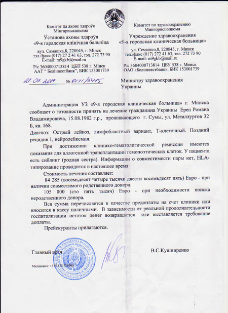 Такую операцию берутся делать белорусские врачи. Стоимость данной операции составляет 105 тысяч евро. Это очень большая сумма для нашей семьи!