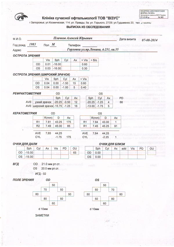 В последнее время Леша начал замечать, что зрение стремительно стало падать. Забив тревогу, и пройдя обследования у офтальмологов, он узнал, что ему в ближайшее время необходимо сделать операцию, и чем скорее, тем лучше. Врачи сообщили, что у него развилась дистрофия сетчатки и установили новый диагноз – миопия высокой степени, сложный миопический астигматизм, периферическая хориоретинальная дистрофия сетчатки. На сегодняшний день, его зрение упало до -15.