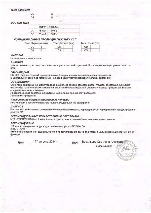 Диагноз: Миопия высокой степени, дистрофия сетчатки.