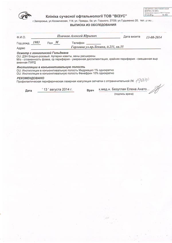 Врачи рекомендовали в ближайшее время ему провести профилактическую лазерную коагуляцию (прижигание сетчатки лазером). Данная операция необходима для того, чтоб Алексей не утратил оставшееся зрение, так как сетчатка у него истощена, и в любой момент в «слабых» местах, может произойти разрыв, в результате чего, она свернется, и он утратит оставшееся зрения. После отслойки сетчатки, зрение еще возможно будет восстановить, но стоить операция будет в разы дороже, и будут утрачены драгоценные проценты оставшегося зрения.