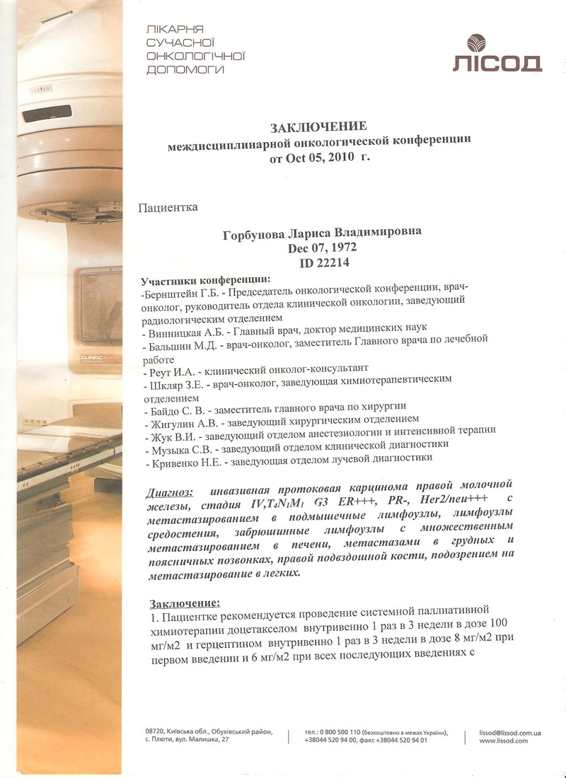 Хочу поделиться с Вами своим горем и просить о помощи. Моя дочь Горбунова Лариса болеет страшной болезнью онкология четвертой стадии, мы боремся с болезнью уже четыре года, когда лечились дорогостоящей химией были положительные результаты, которые превзошли даже все ожидания врачей. Но за три года все наши сбережения закончились, и мы были вынуждены перейти на более дешевую химиотерапию. К сожалению, это лечение ничего не дало и ей становилось все хуже и хуже, пока в легких не набралась жидкость, которую откачивали, состояние стало очень плачевным. Получила направление на лучевую терапию, после каждого сеанса ей очень плохо, мучают сильные боли, ломит все кости. Там, где откачивали жидкость из легкого постоянные боли.