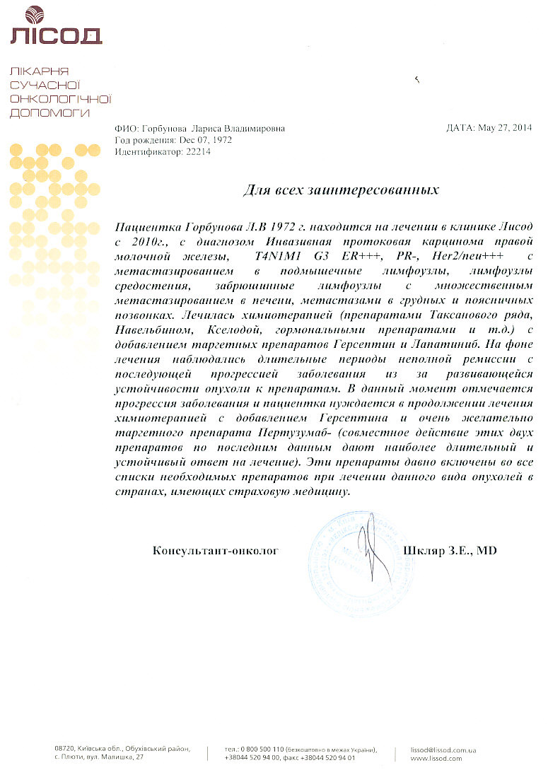 Сейчас ей предлагают другую химиотерапию, но боюсь она не выдержит, сильно подводит сердце. Мне очень помогал мой муж, но к сожалению, он умер в октябре, сын тоже умер, осталась только дочка и внучка. У моей дочери есть муж он работает где придется то на стройке, то с другом бассейны делают, то на базаре грузчиком, чтобы заработать хоть что-нибудь официально трудоустроиться не получается поэтому у него нет трудовой книжки. Решили продать квартиру, переехать в маленькую, но в связи с этим положением в стране никто не покупает. Думала продадим и сможем пролечить Лорочку «Герцептином», но не получается, приходится надеяться на добрые и отзывчивые сердца добрых и неравнодушных к чужому горю людей. Я не прошу, я умоляю отзовитесь на мою мольбу о помощи. Помогите мне спастимою дочь имаму для моей внучки, ведь ей всего 10 лет.