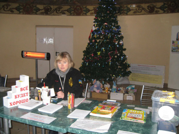 Сьогодні волонтерів двоє: о 9 ранку я бачу, як Надія Риндіна та Тетяна Самбуєва, а також представник ДСНС (Державна служба з надзвичайних ситуацій) та соцпрацівник займають свої місця за столом. Тут облаштований повноцінний пункт допомоги переселенцям: дошка інформації, кошик для збору грошей, гарячий чай, ялинка і подарунки.