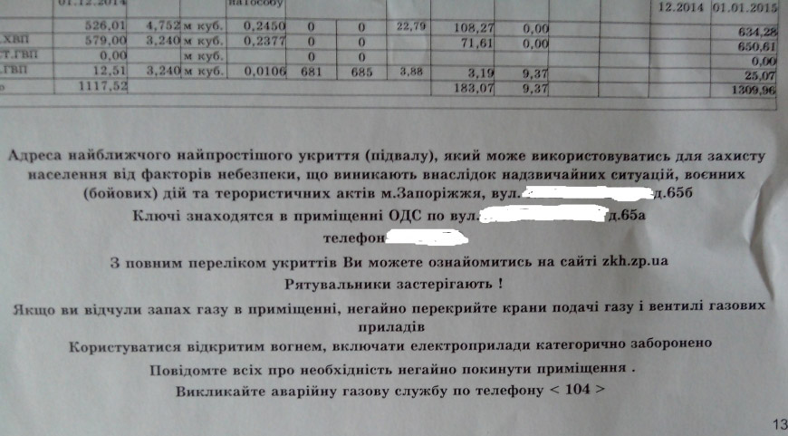 Еще один способ получить нужную информацию – присмотреться к тому, что печатают в платежках. Цифр не пугайтесь, смотрите ниже. В «подвале» квитанции речь идет как раз о том, где находится ближайшее к вашему месту проживания укрытие, и где хранятся ключи от него. Отметим, что если дом кооперативный или ОСМД такой информации в платежках может и не быть.