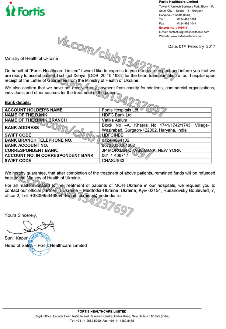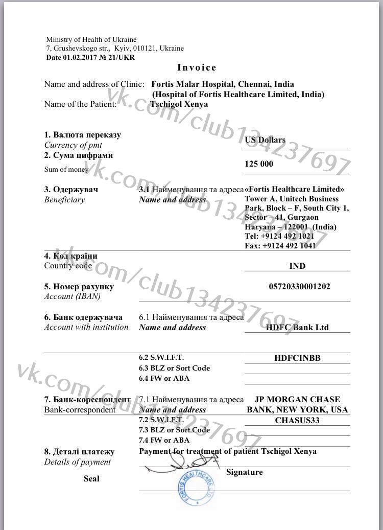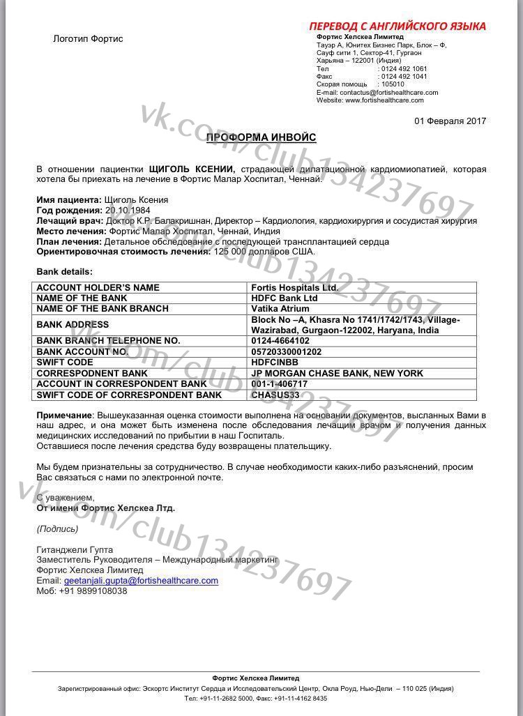 Клиника " ФОРТИС" в Индии готова принять Ксению на лечение, но сумма неподъемная для семьи, близких и знакомых Ксении. Выставлен счет в 125 000 долларов...