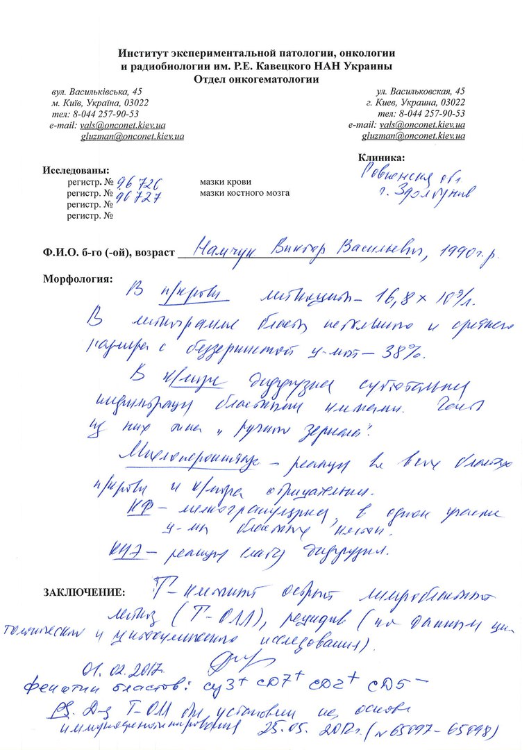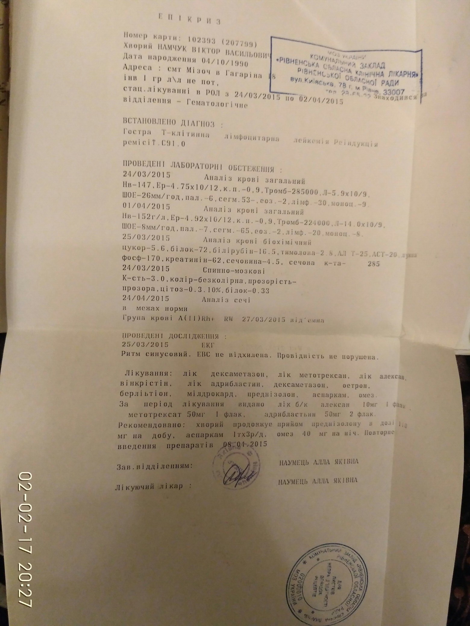 «Мій син Намчук Віктор Васильович захворів 22-го травня 2012 року. Діагноз, який був поставлений в Київському інституті ім. Кавецького–Т клітинний гострий лімфобластний лейкоз. Лікувалися в Рівненський обласній клінічній лікарні в гематологічному відділенні з 22 травня 2012 року по 20 вересня 2015 року. За цей час пройшли основне лікування і шість курсів підтримуючої хіміотерапії та велику кількість препаратів (даунорубіцин, вінкрістін, Аспарагінозе, метотрексат, цитозар, етопозид, алексин, доксолік, ендоксан, доксорубіцин, адрибластин, ліолів, ліпофлавон, контрікал та інші). Сорок сім людей здавали для сина кров. Пройшов курс променевої терапії на головний мозок на апараті Л-прискорювач Електа.»