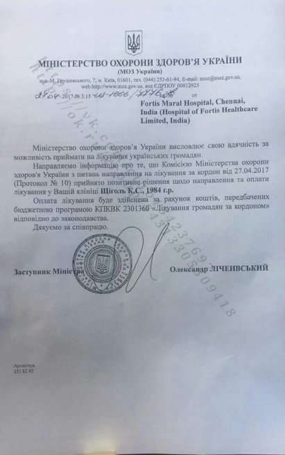 Ксения получила положительное решение Министерства охраны здоровья Украины на оплату лечения в Fortis Maral Hospital (Индия). Желаем скорого выздоровления, успеха и счастья Ксении и всей её семье!