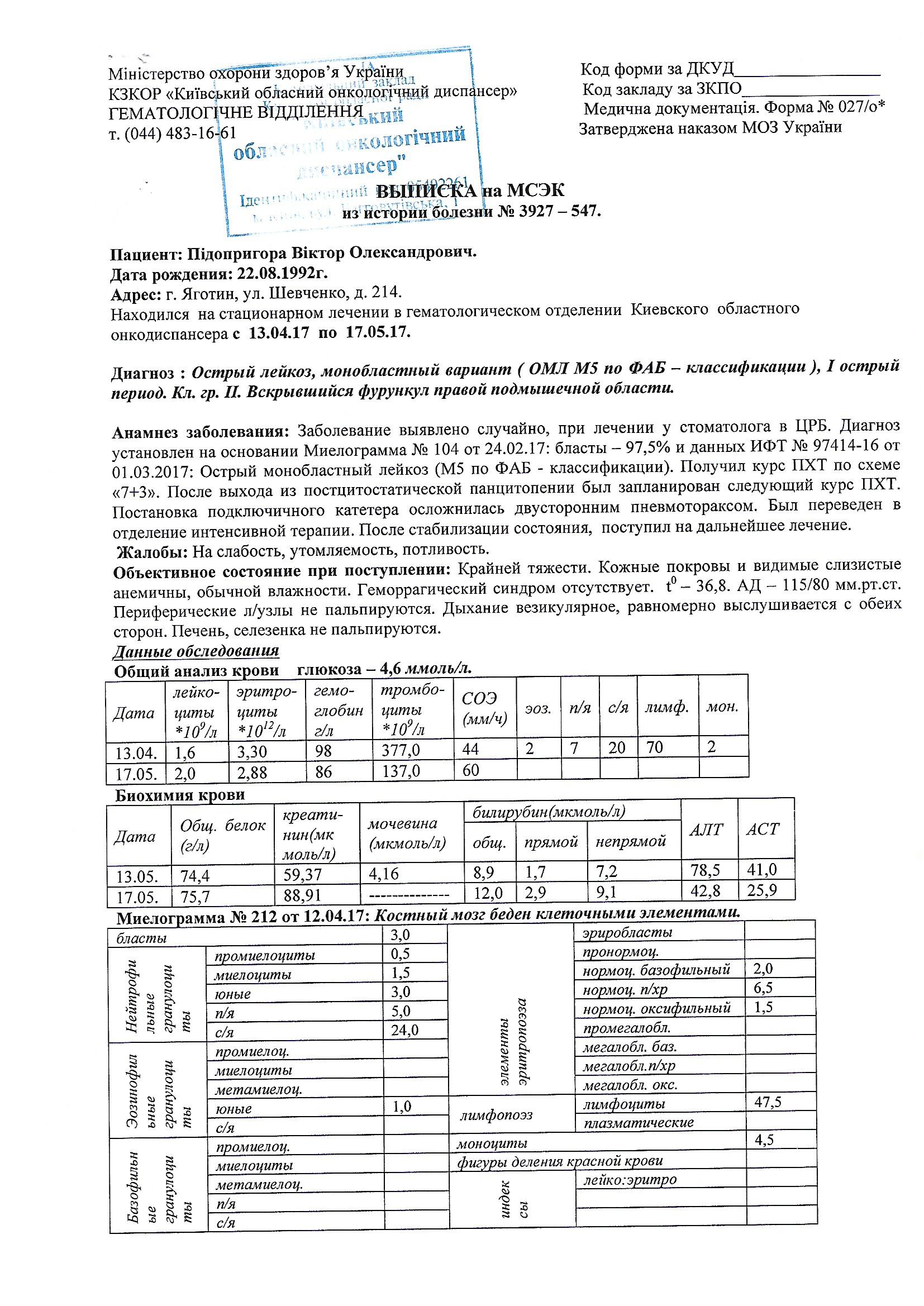 Как приходится жить Виктору каждый день, мы узнали с его письма: «Меня зовут Виктор мне 25 лет, проживаю в городе Яготин, который находится в Киевской обл.. Большая беда всегда приходит неожиданно так случилось и со мной. Мне поставили страшный диагноз - острый монобластный лейкоз. Я до болезни всегда был позитивным человеком, не имел вредных привычек, в более юном возрасте занимался туризмом, затем учился на отделении социальной работы, но так сложилось, что все же пошел работать в другую сферу и работал оператором раскройного оборудования.»