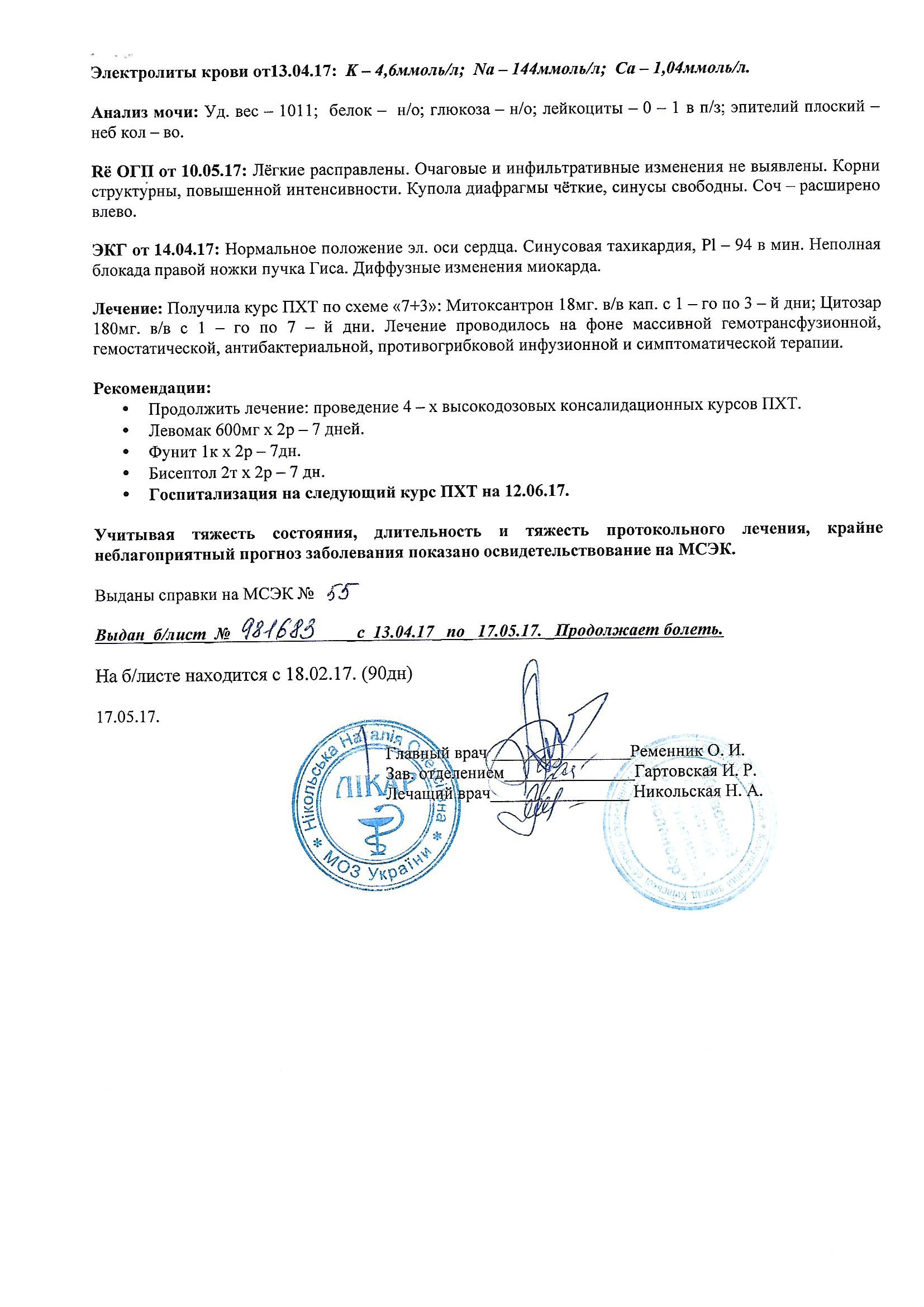 Надежда никогда не умрет! И как только появится шанс, то бейтесь, рвите, дерзайте, кусайте, но ни в коем случае этот шанс не отпускайте: «Далее постоянная температура и плавное отхождения от химиотерапии. После очередной сдачи анализов все узнали, что я имею не плохие шансы избавиться от этой болезни. Несколько дней передышки и до следующей химиотерапии, но я попал в реанимацию в которой провел целую неделю. Почти сразу после этого начали вторую химиотерапию. Она, наконец ,прошла лучше, но все равно мучали постоянная температура и другие последствия. Затем долгожданное улучшение. Сейчас период оформления группы инвалидности и небольшая передышка перед будущей химиотерапией, в надежде, что все же будет возможность ее начать.»