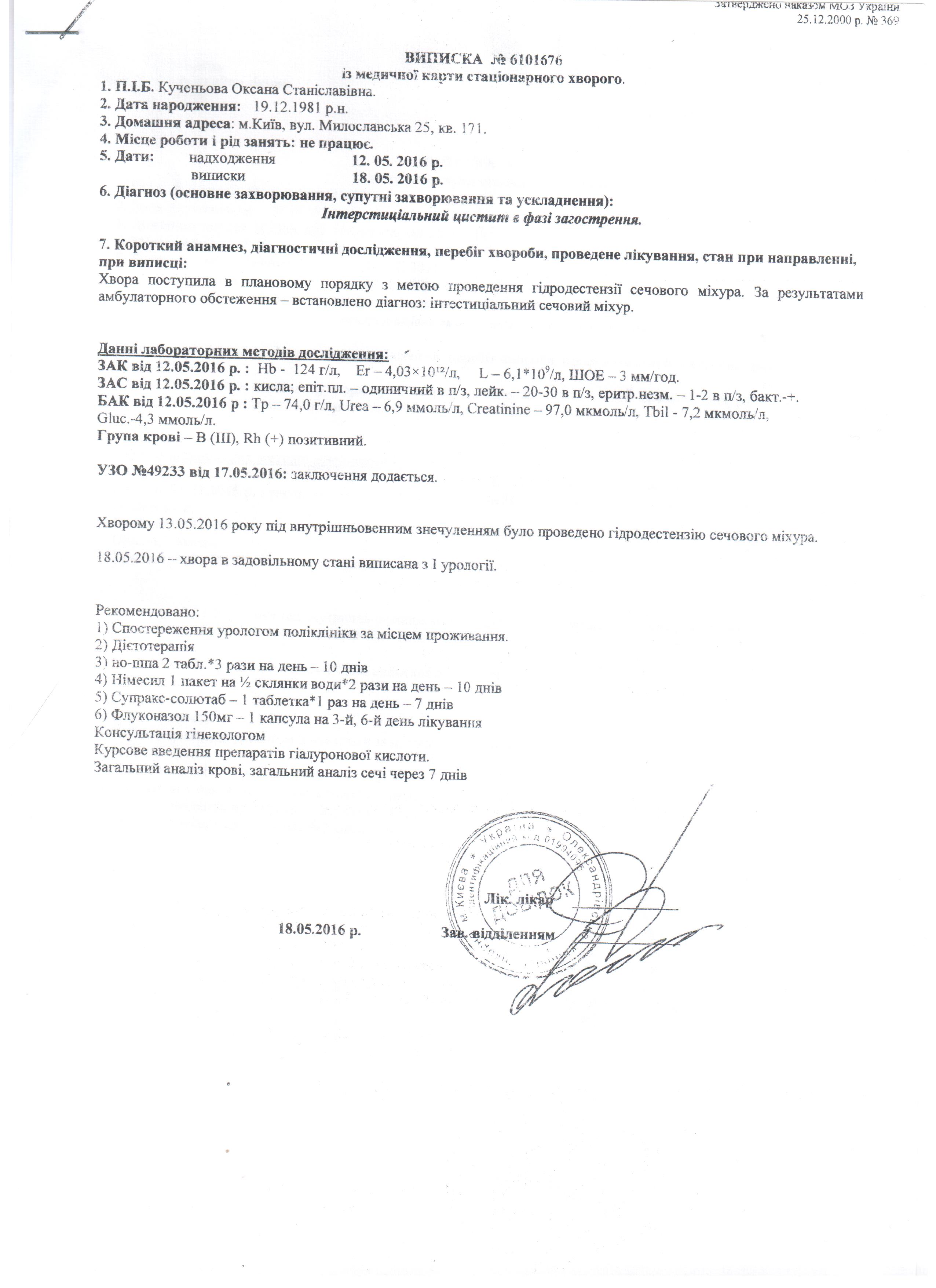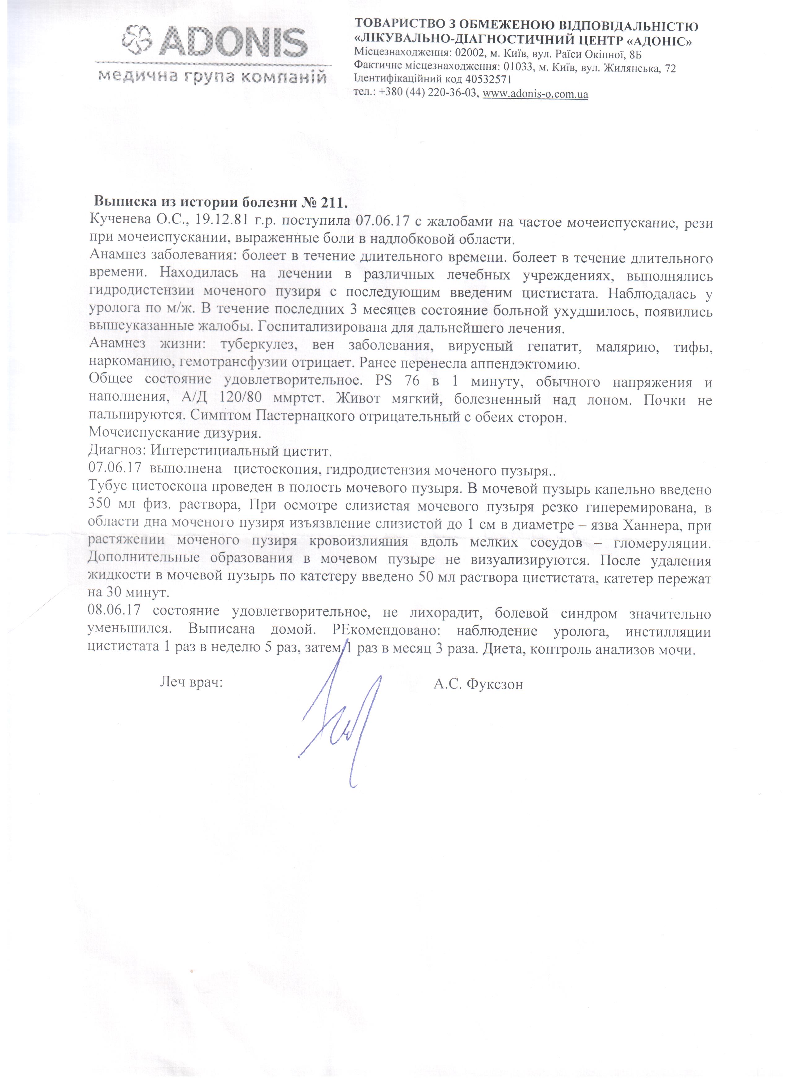 Битва продолжается и есть шанс победить, но также еще есть несколько преград: « С 2013 года началась борьба за орган (спасение мочевого пузыря, методом ежегодных растяжек и ежемесячных заливок лекарства на основе гиалоурановой кислоты в мочевой пузырь). В 2016 г., при растяжке мочевого пузыря, врач сказал, что есть ещё за что бороться.В этом 2017 году сказал, что нужно удалять полностью (в туалет хожу более 50 раз в день и это после растяжки мочевого, которая была 07.06.2017, и это всё сопровождается с ужасными болями, резями, не досыланием, недомоганием и т.д.…). Это очень сложная и тяжелая операция, и наши врачи ни дают никакой гарантии, что со мной всё будет после операции хорошо, а зная наших врачей –«мясников чудесников» и как они меня лечили 12 лет, становится очень страшно за себя и свою жизнь! Сейчас ведутся переговоры со странами, где такую сложную операцию делают: Франция и Израиль с помощью DaVinci (робот-хирург) – это ювелирная работа, после чего пациент быстро восстанавливается, он может удалить мой замученный весь в язвах мочевой и сделать новый из прямой кишки, после чего я сама смогу ходить в туалет как нормальные люди!»
