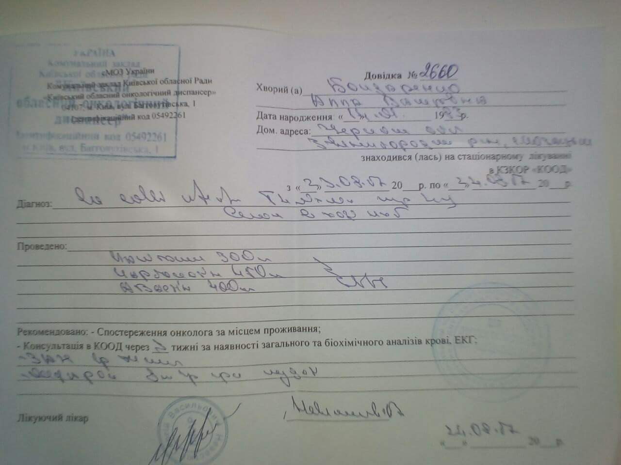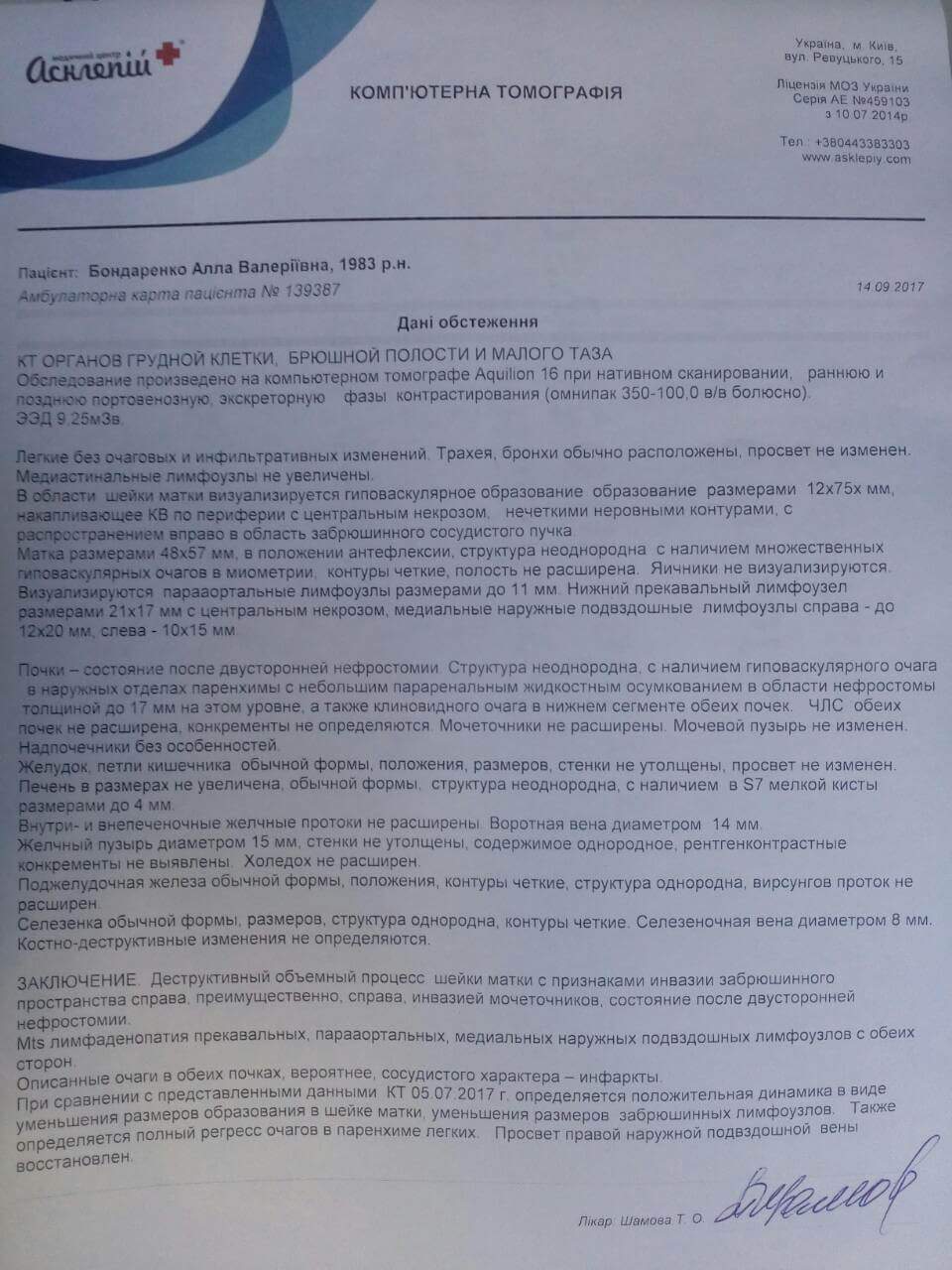 Сейчас мы узнаем эту историю, в которой много боли и борьбы: «Моей сестре поставили диагноз "рак шейки матки" 2 стадии в марте этого года, случай неоперабельный. Алла получила два курса лучевой терапии весной. Но рак быстро прогрессирует и сейчас она имеет 4 стадию с затемненными участками в лимфатических узлах забрюшинного пространства. Она похудела, опухоль ест ее с середины - время от времени ухудшаются показатели крови, является острая почечная недостаточность, постоянные боли, моча выводится искусственно - через приемники. Достоверно сказать, почему этот рак вцепился именно в мою 34-летнюю сестру, врачи сказать не могут, от этого не застрахована ни одна женщина. Сейчас Алла прошла три блока химиотерапии, как минимум должны быть еще два (каждый стоит около 20 000 грн).»