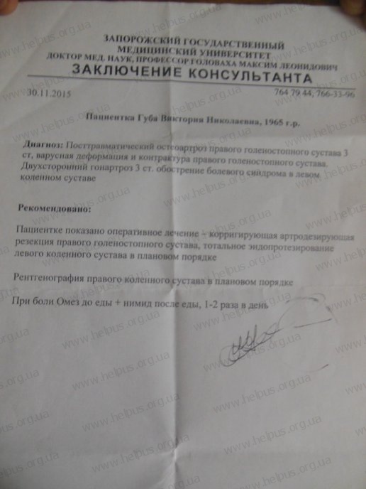 Сегодняшний диагноз Виктории Николаевны гоноартроз 3 степени, без экстренного хирургического вмешательства ей грозит полный паралич. Собрать 20 000 одинокой женщине в незнакомом маленьком городке вообще нереально, но если взяться за дело всем миром, то операция состоится.