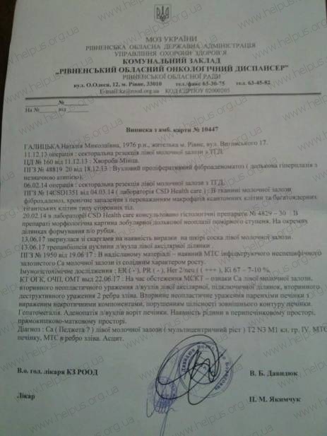 Главное не терять надежду, верьте в себя и своих родных!!: «После рождения сына поставили страшный диагноз - РАК МОЛОЧНОЙ ЖЕЛЕЗЫ. Слава Богу, вовремя обнаружили и прооперировали. В августе болезнь вернулась и уже в более агрессивной (4 СТАДИЯ РАКА). Поражение потерпели не только грудь, но и печень, поджелудочная, желудок и ребра. Сказали отечественные врачи, что срочно лечиться, ТОЛЬКО МЫ НАДЕЖДЫ НЕ ДАЕМ. К сожалению, из всех иностранных клиник откликнулась только одна. Это Германия - н. Шванфурт клиника Леополдина-Krankenhaus. После повторного обследования в них подтвердили диагноз и что ситуация очень тяжелая, но шансы вылечиться есть, но они тоже не всесильны. Только стоимость очень дорогая. Стоит пройти химию - 6 блоков по 17.000 евро каждая. Шанс хоть самый малый, но он есть. И мы его не упустили. Мы продавали все, кто что имеет. Кто что может. Деньги где только не собирали: друзья, знакомые, муж продал свой небольшой бизнес, который их кормил все эти годы, кредиты.»