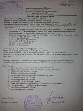 Как говорит сама Марина: «Но даже при таком диагнозе я не отчаиваюсь, и все делаю для того что бы вылечиться. Лежала в больнице в Киеве 10 дней, потратила 5 тыс. грн. Занимала у сестры. Но диагноз мой очень ужасный, гидронефроз почек обоих, в левой почке поставили нефростому, врач сказал, что в недалеком будущем это ожидает и правую, вся проблема в том. что мочевой пузырь сморщился, его практически нет, а из-за этого пошел процесс и на левый мочеточник и тоже будет с правым. Нужно делать очень сложную операцию, что бы исправить это. Операция дорогостоящая по удалению пузыря и пластики нового из тонкой кишки. Но сумма не то, что не посильная, она просто ставит меня в тупик, а без операции ждет плачевный исход, 50 000 грн. сама операция, + 20-30 тыс. ожидается реабилитация, где таких денег взять? Я прошу помощи у вас, помогите мне вернуть здоровую жизнь!»