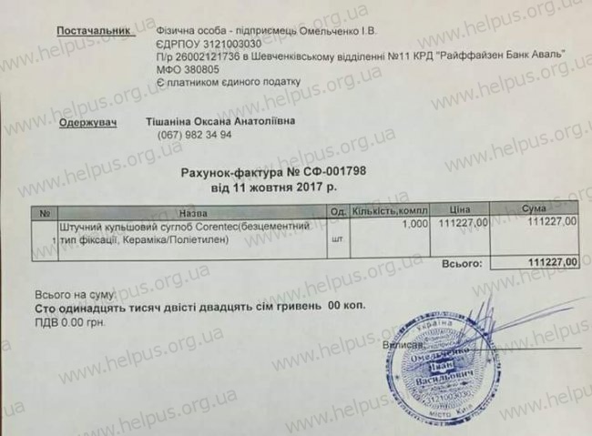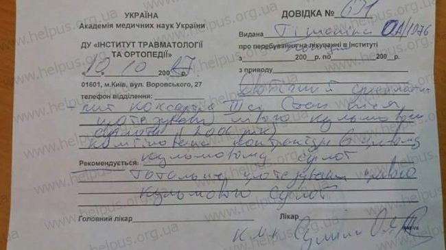 «Сейчас нашей малышке 4.4 года. Встала та же проблема, но теперь с правой ногой. Стерся хрящ на бедренной головке и образовалась киста, нужно поставить искусственный бедренный протез, и делать пластику тела. Стоимость такой операции 111227 гривен. Таких денег у меня нет. Получаю пенсию по инвалидности 3-й группы - 1490 грн. Не работаю, снимаю квартиру. Хочется стать полноценным человеком, больше гулять со своим ангелочком, третий месяц сижу в квартире, наблюдая погоду из окна. Я прошу всех неравнодушных. Дайте надежду на выздоровление, помогите мне вернуться к нормальной жизни и полноценно воспитывать свою доченьку.»