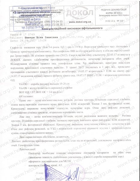 Диагноз: Усложнённая катаракта обоих глаз, сахарный диабет.