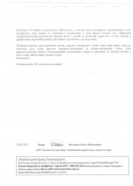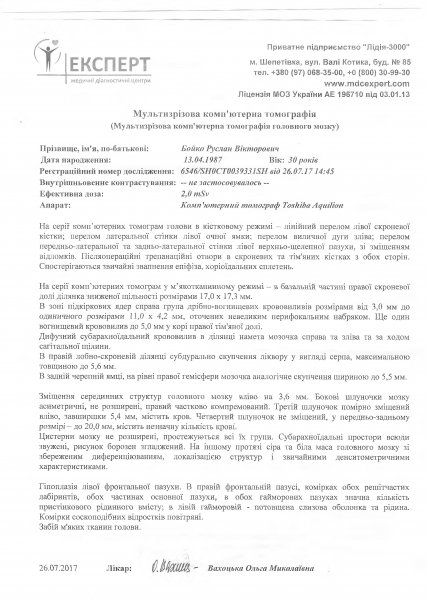 Рассказывает сестра Руслана: «Мой брат, Бойко Руслан Викторович живёт с женой и 9-ти летним сыном в доме своей матери. 19.07.2017 г. Руслан ехал на скутере из магазина домой. По словам свидетелей, он видимо не увидел на асфальтовом покрытии небольшой выбоины и колесо скутера вскочило в нее. В результате, скутер потерял равновесие, Руслан не справился с управлением, упал и получил черепно-мозговую травму. Скорая помощь доставила его в реанимационное отделение в бессознательном состоянии. Вызванные из областной больницы нейрохирурги провели неотложную операцию (для удаления жидкости). Через неделю после операции, в городе Шепетовка, Руслану сделали МРТ, где были выявлены многочисленные закрытые переломы черепа, тяжелый ушиб мозга и многочисленные кровоизлияния, парез левой части тела. Через 3 недели начал открывать глаза, но команды не выполнял. В течении 1,5 месяца он пролежал в реанимации без всяких улучшений. Врачи рекомендовали продолжить лечение в реабилитационном центре, так как специалистов у нас в городе нет. С трахеостомой, зондом и катетором без сознания мы доставили его в инсультный центр ReaVita города Ровно.»