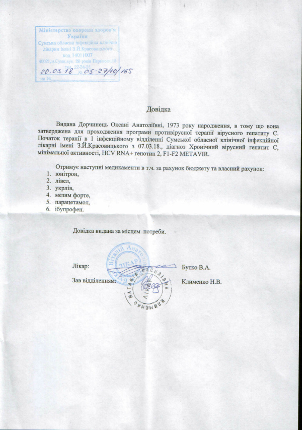 “Прошу оказать мне помощь. Вследствие болезни я потеряла работу, из членов семьи только сын, который тоже найти работу не может. Получила государственную программу по лечению гепатита, что дало мне призрачную надежду на жизнь и, может быть, возможность дождаться внуков. Все мои доходы - это выращенное собственными руками на собственном огороде. Помимо лечения, получаемого за счет государства, необходимы препараты, поддерживающие меня, на это нужно всего 5500-6000 грн., но возможности их собрать уже практически не осталось. Прошу не отказывать мне, и если у Вас возникнет желание помочь или другие вопросы, мои координаты можно узнать в БФ Хелпус.”