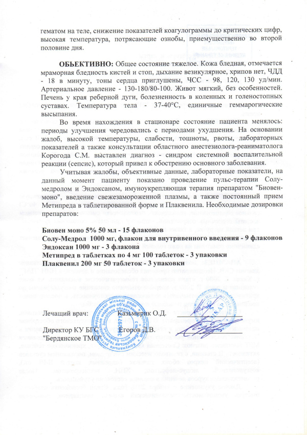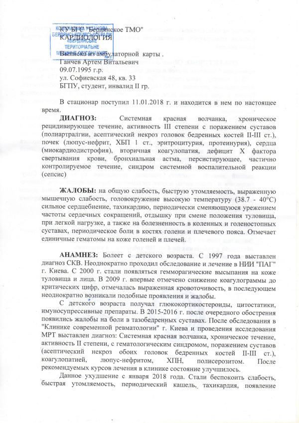 Диагноз: Системная красная волчанка, хроническое рецидивирующее течение, активность III степени с поражением суставов, почек, сердца, вторичная коагулопатия, дефицит Х фактора свертывания крови, бронхиальная астма.