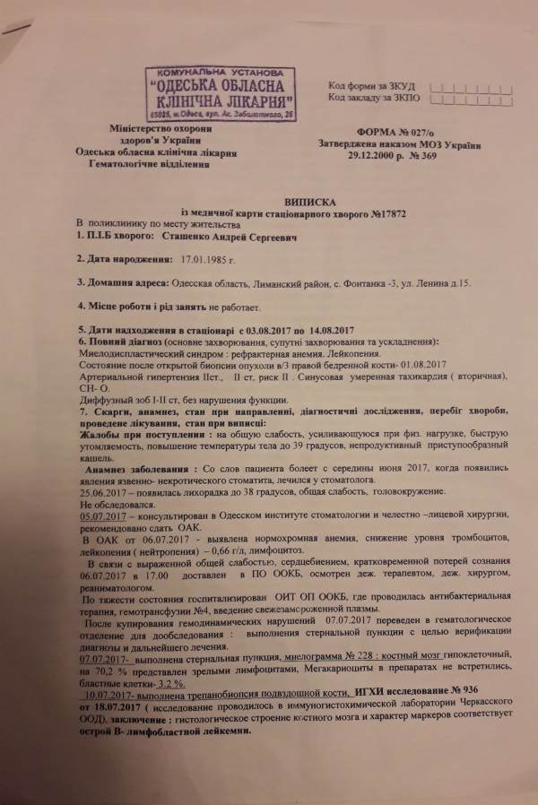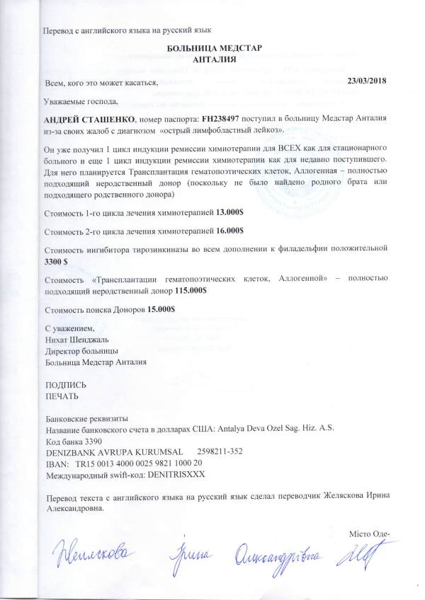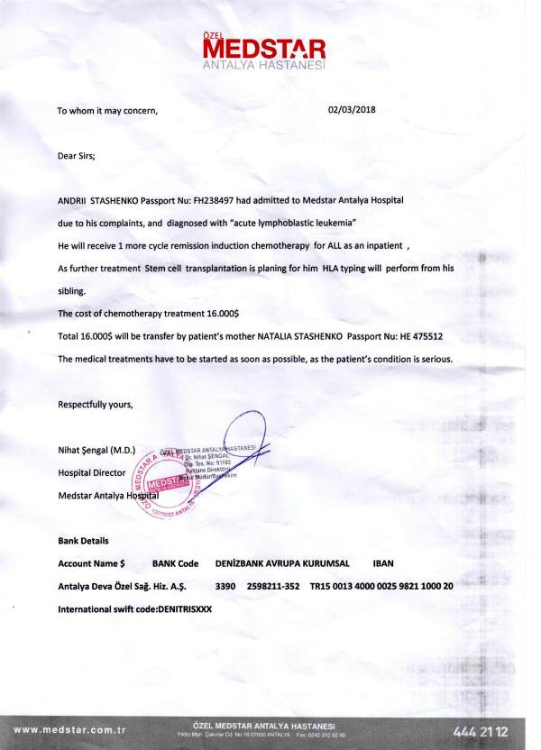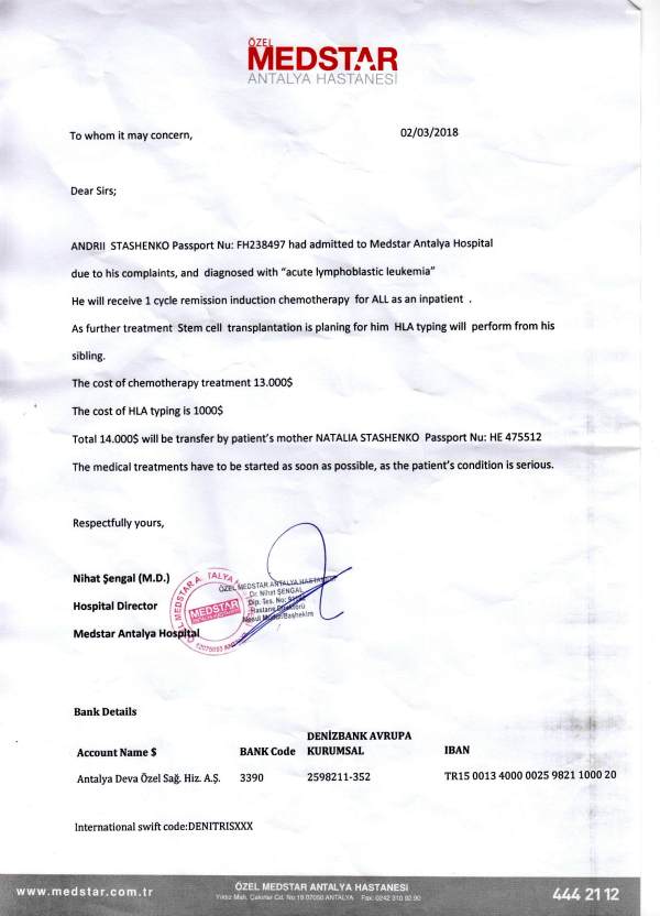 Состояние резко ухудшилось, Андрей практически уже не мог вставать с кровати, и в конце февраля турецкая клиника подтвердила первоначальный диагноз украинских врачей – острый лимфобластный лейкоз. В итоге назначен протокол лечения – две химиотерапии и трансплантация костного мозга. Сумма для обычной одесской семьи просто огромна!