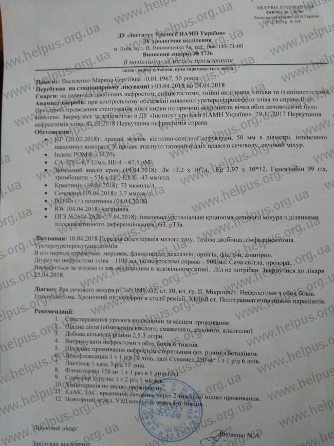 «Снова на мою долю выпало новое серьёзное испытание, – пишет нам Марина, - выдержала сложную операцию, тяжелый послеоперационный период, радовалась, что все позади, строила планы, но... После гистологии у меня определили инвазивную карциному мочевого пузыря с участками плоскоклеточной дифференцировки. Для начала назначили пройти 3-4 курса химиотерапии. Стоимость одного курса - 7700 гривен. После долгого лечения и операции, деньги потрачены. Поэтому я вновь обращаюсь за помощью к добрым, небезразличным людям. Я буду искренне благодарить за любую помощь, за советы, которые помогут в сборе средств и материальную поддержку. Верю в людей, верю, что мир не без добрых людей, которые могут подарить мне шанс на жизнь! И хочу искренне поблагодарить тех, кто уже пожертвовал средства мне на операцию и реабилитацию. Без вашей поддержки в моей ситуации очень сложно выжить, та как наши мизерные пенсии не позволяют человеку лечиться.