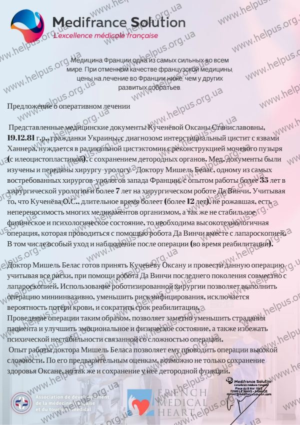Несмотря на все отказы украинской медицины, Оксана надеется на полноценную жизнь. Ведущий специалист французской клиники Мишель Белас предложил провести высокотехнологичную операцию, которая проводится путём лапароскопии при участии робота Да Винчи. Суть операции заключается в удалении старого мочевого пузыря и формирования нового из тканей прямой кишки. Использование роботизированной хирургии позволяет выполнить вмешательство наименее инвазивно, уменьшить риск инфицирования и вероятность потери крови. Но главное – это шанс для женщины в будущем стать мамой. А это самая большая мечта Оксаны. Чтобы осуществить ее, нужно 25 375 евро.