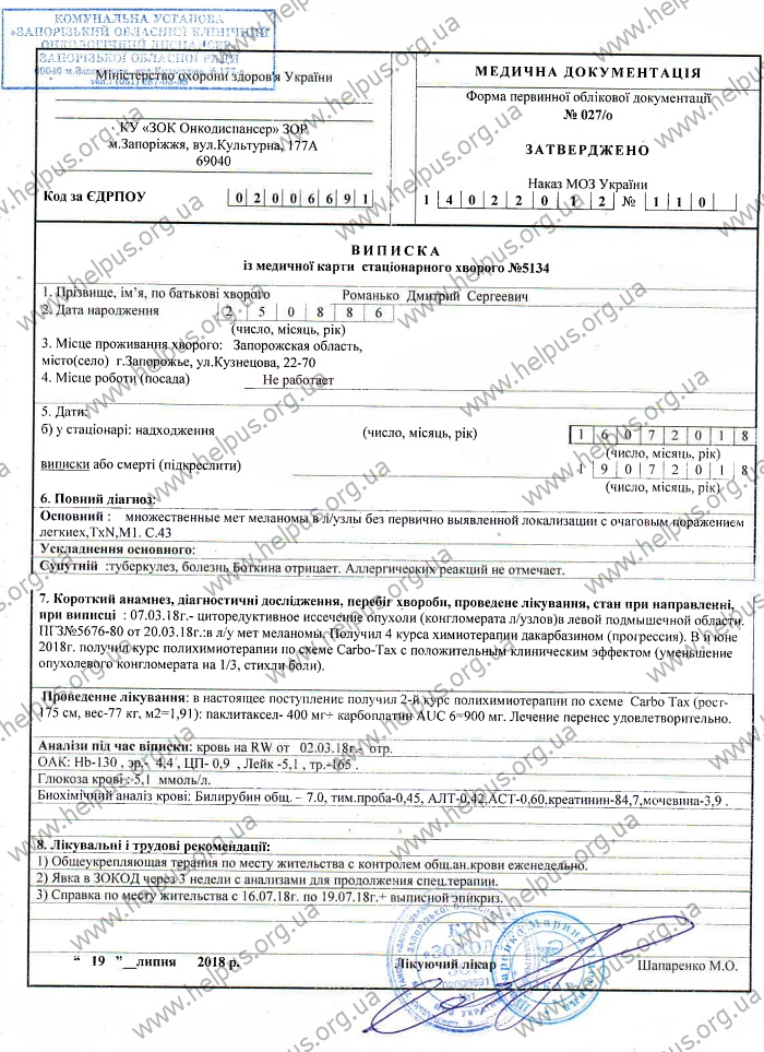 78 | 29.01.2019 | Переміщено з напрямку: Гордиенко Ирина (Меланома) | 14.61 грн |
