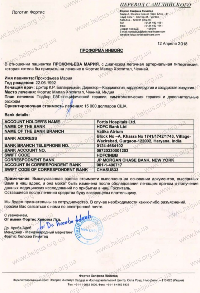 Клініка Індії надала мені рахунок для сплати, у розмірі 15 000 доларів! Та це тільки обстеження та процедури! Професор Балакрішнан, який поставив мене на ноги, під час приїзду до України назначив мій приїзд у Індію восени, а поки прописав крапельницю «Мілренона». Але ці дорогі препарати, що я закупила раніше, виявилися вже не придатними.
