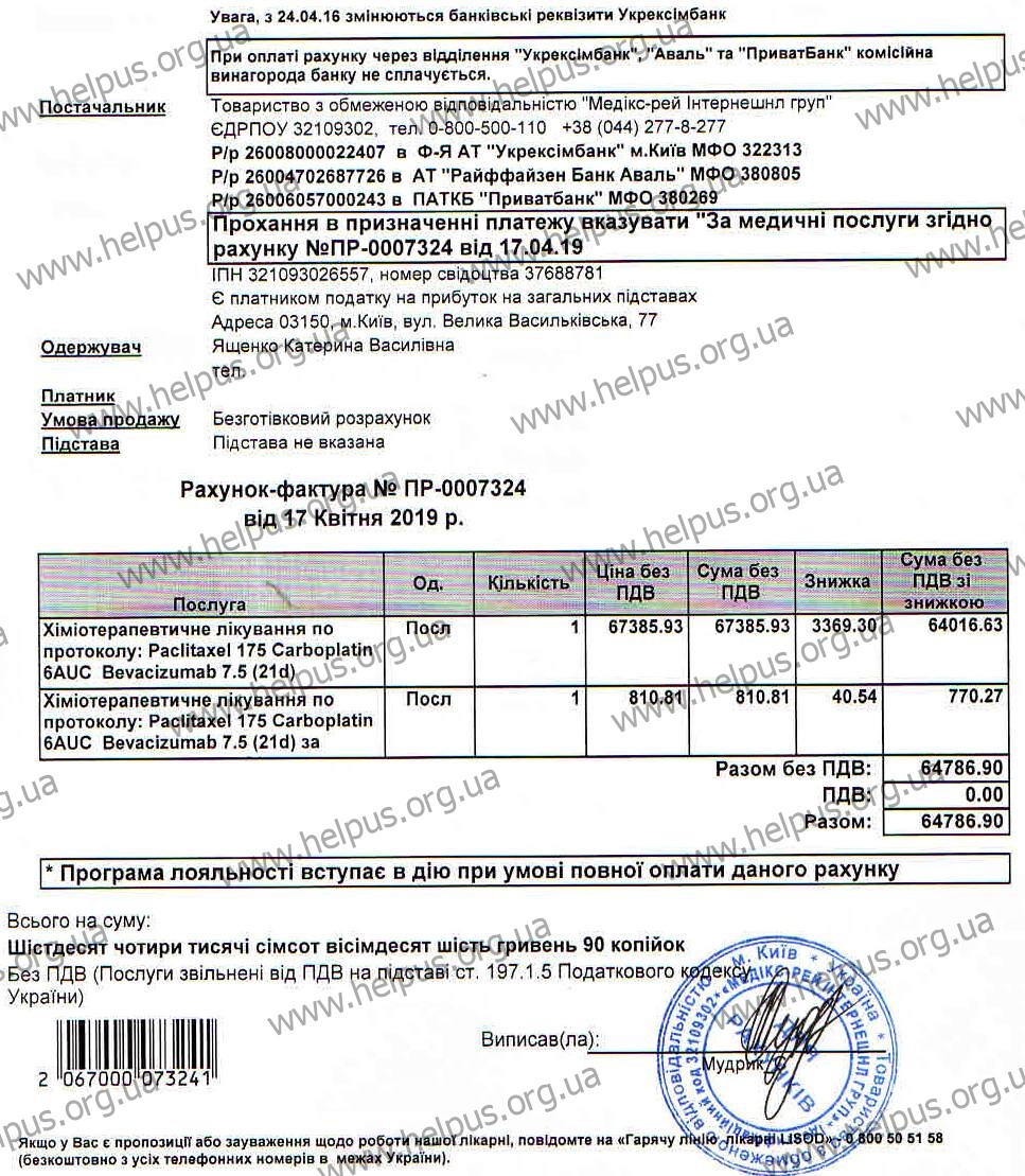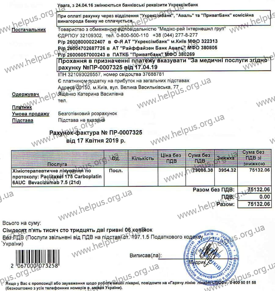 После трех курсов химиотерапии, которые проводились с использованием препарата Авастин, появилась положительная динамика. Для достижения существенного результата необходимо пройти еще шесть курсов. Екатерину поддерживают друзья, знакомые – все те, кому она сама когда-то помогала. Но чтобы вырваться из ловушки страшной болезни, этого недостаточно. Сегодня мы просим помочь собрать средства на два курса химиотерапии. Для этого необходимо 135 000 гривен.