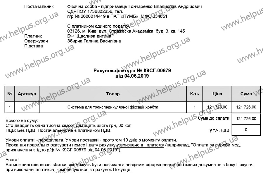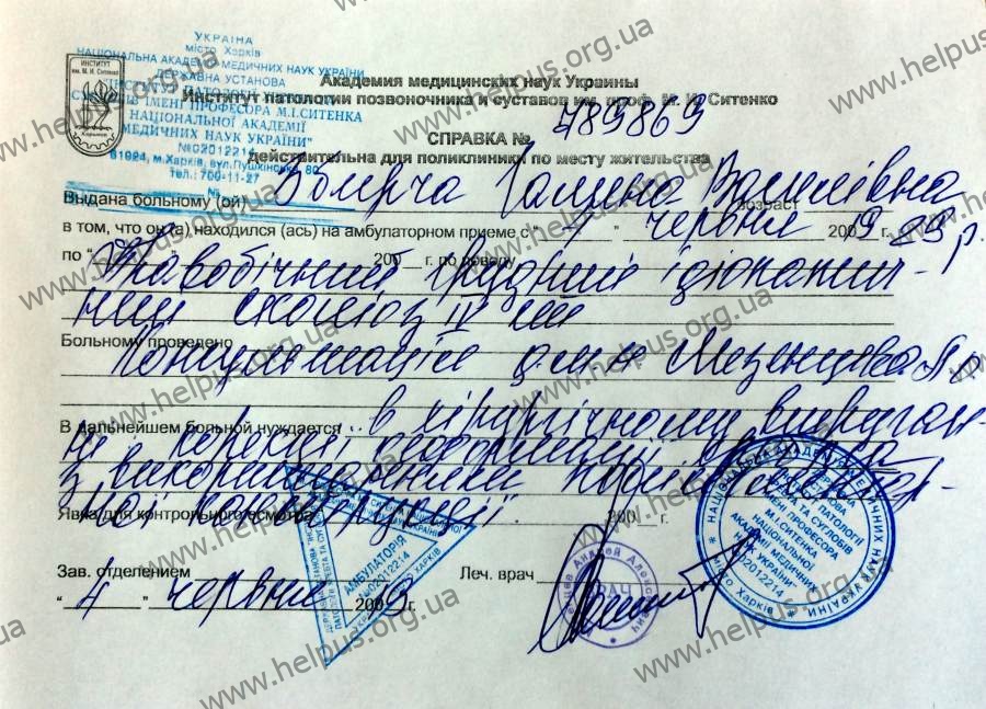 З’явилася найзаповітніша мрія – відчути радість материнства. Та з такою хворобою вагітніти ніяк не можна. Тому Галина остаточно зважилась на хірургічне втручання. Зі слів лікарів Харківського інституту патології хребта, потрібні дві операції, встановлення титанових імплантів та тривала реабілітація. Частину суми вдалося зібрати за допомогою небайдужих людей та власними силами. Не вистачає коштів для придбання системи фіксації хребта, без якої операція неможлива, а саме 121 726 гривень.