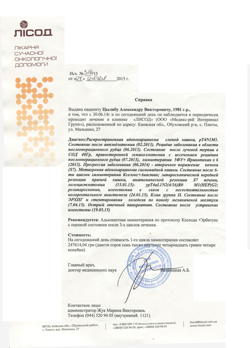 Рекомендуется: Адьювантная химиотерапия по протоколу Кселода + Эрбитукс нужно 3 - цикла лечения. На сегодняшний день стоимость 1-цикла химиотерапии составляет 247614,04 грн. (двести сорок семь тысяч шестьсот четырнадцать гривен четыре копейки).