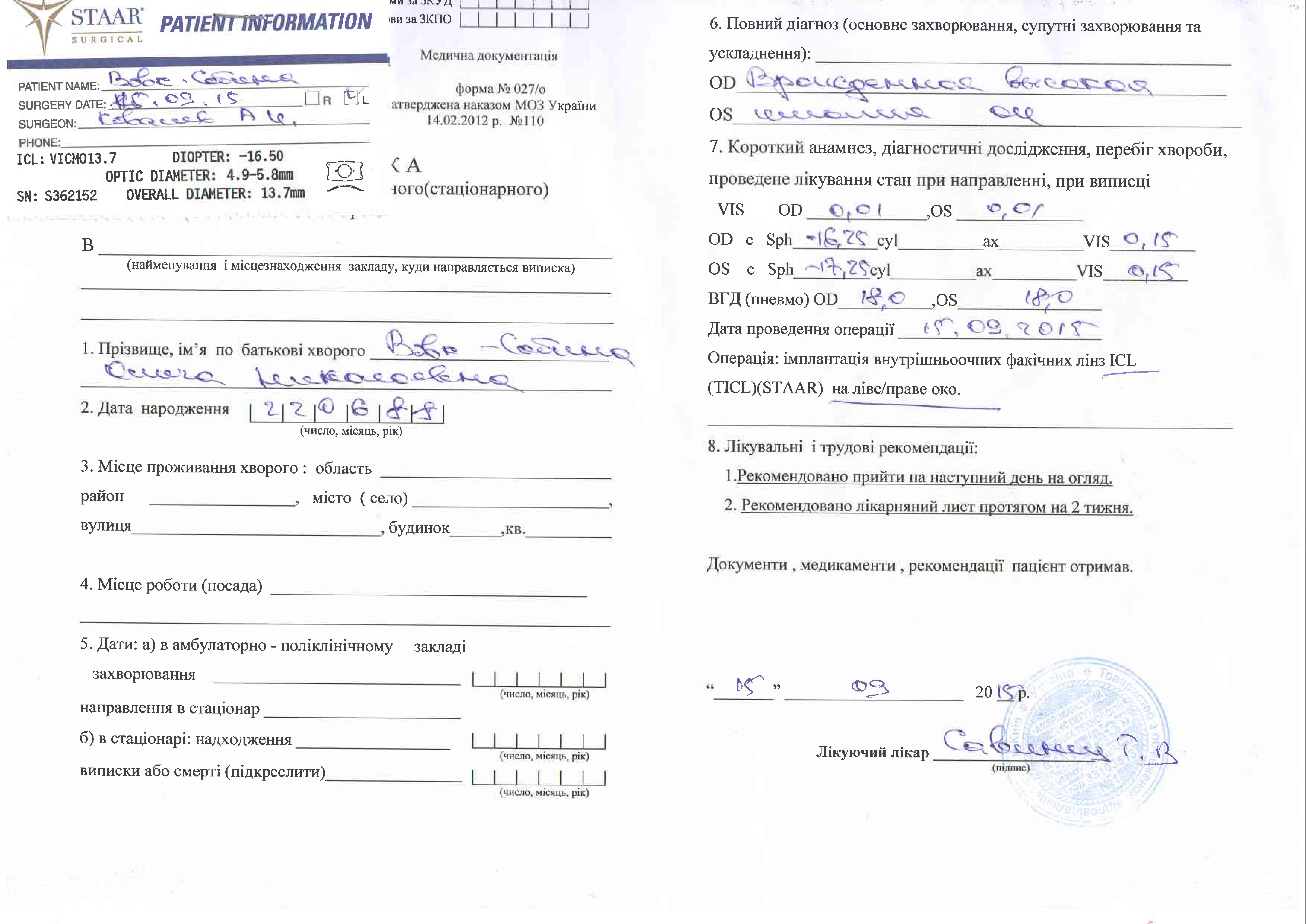 До операции у меня было 0.02% зрения, сейчас же почти 35%.