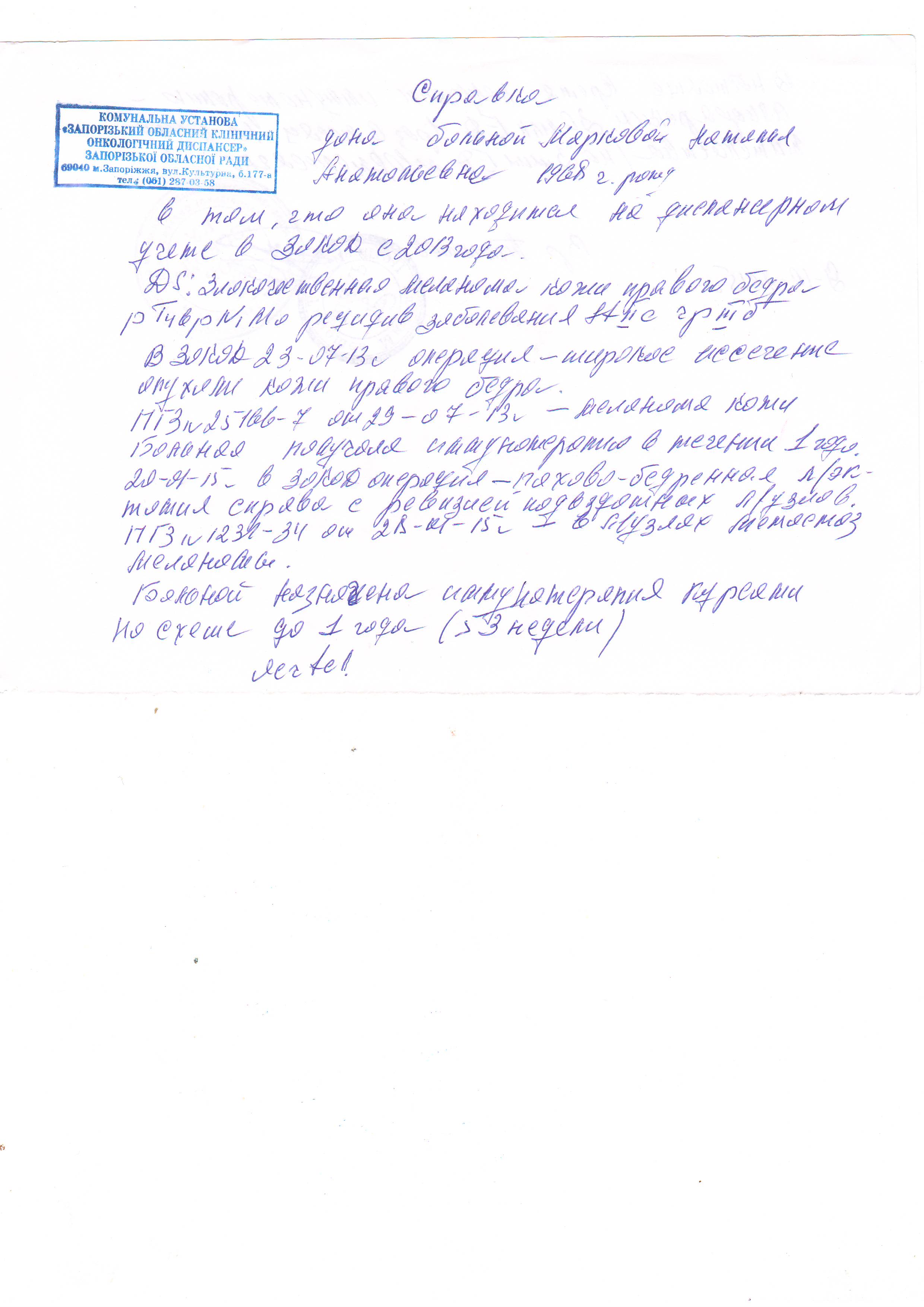Меня зовут Наталья, мне 46 лет. Родилась в селе, с 8 лет живу в городе. Я - инвалид детства ДЦП, мне очень трудно ходить, мой диагноз «Паропорез нижних конечностей». Родилась я шестимесячной девятьсот грамм. Мама мне рассказывала, что по мне было видно, как я хотела жить. С помощью мамы и врачей я выжила. И вот, сейчас в 46 лет снова борьба за жизнь: У меня заболела родинка – кровила и сочилась, ее удалили в 2013 году. Диагноз - злокачественная меланома. Лечение дорогое, каждые 2-3 месяца УЗИ лимфоузлов или томография. Лечилась год и пять месяцев. Увеличился лимфоузел. 20.01.2015 года сделали операцию по удалению лимфоузла. И снова лечение. Денег на лечение совсем нет. Прошу у вас помощи, чтобы снова выжить.