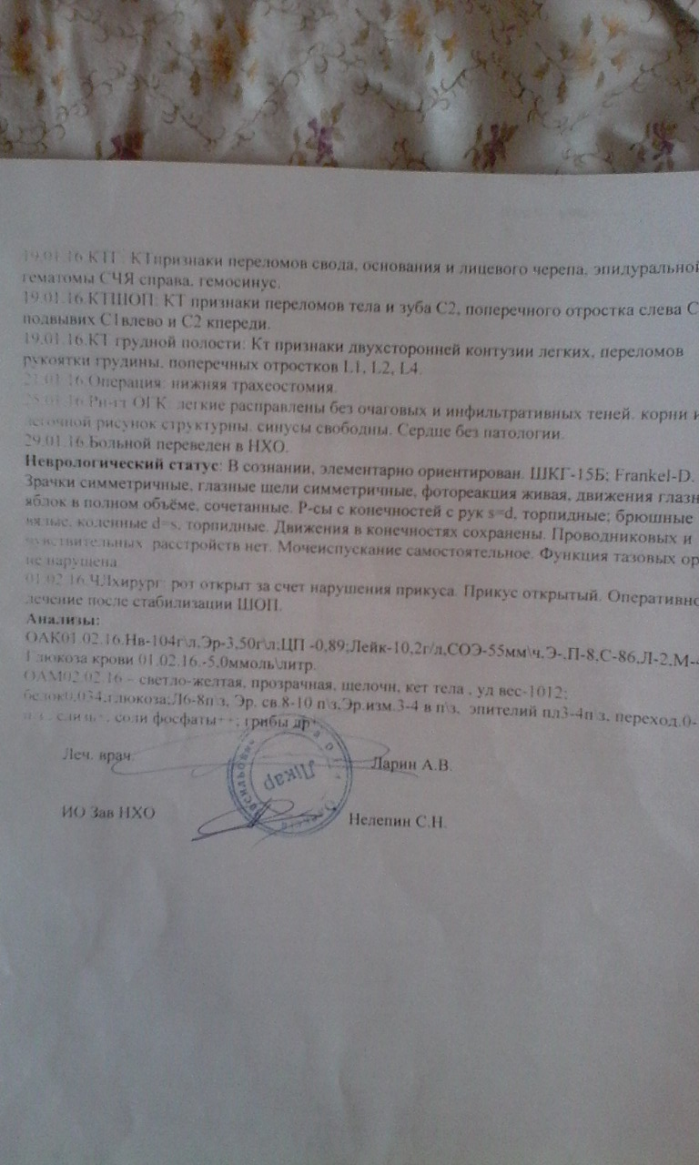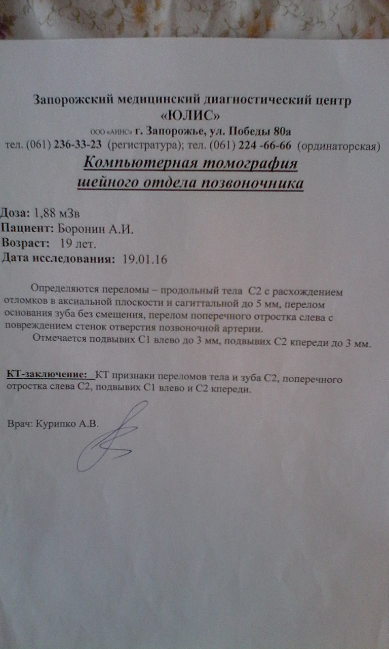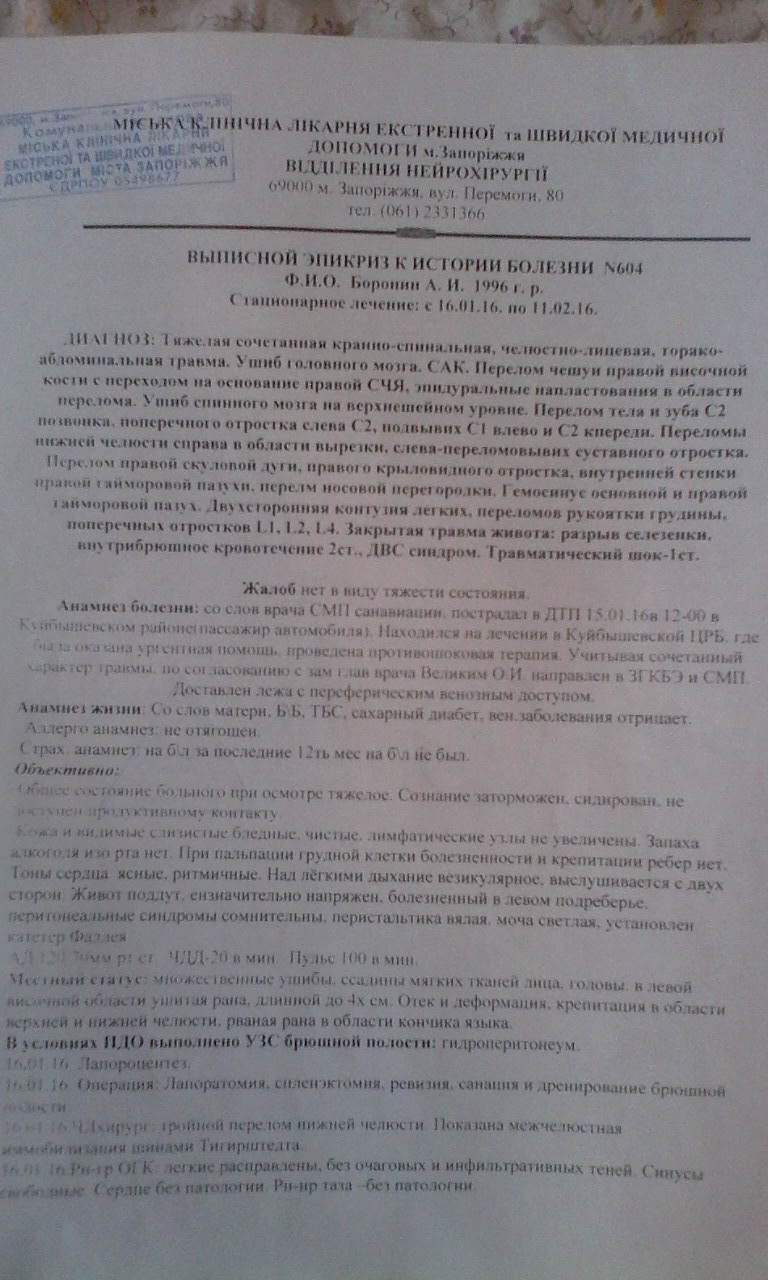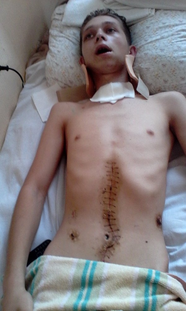 19 января, когда Саша так и не пришел в себя, ему была сделана томография головного мозга, шейного и грудного отделов и были выявлены переломы 1 и 2 шейных позвонков, переломы грудного отдела, контузия легких и сердца. Саша, хотя уже дышал самостоятельно, был опять подключен к аппарату искуственного дыхания и искуственно поддерживался в сонном состоянии, чтобы своей подвижностью не нанести больший вред. На шею ему был одет жесткий воротник и только 29 января врачи сочли возможным вывести Сашу из сонного состояния и он пришел в себя к огромной радости мамы и всех друзей. Он был переведен в отделение нейрохирургии этой же больницы (лечащий врач Ларин Алексей Васильевич). Но так-как операция на шейных позвонках не могла быть проведена специалистами г.Запорожья