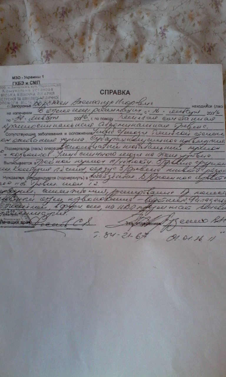 15 янаря 2016 года произошла авария в пгт Куйбышево. Саша был доставлен в отделение реанимации Куйбышевской районной больницы с диагнозом ушиб головного мозга и перелом нижней челюсти. Из-за травматического шока только в полдень следующего дня Сашу смогла забрать бригада реанимации из Запорожья. По приезду в 5 городскую больницу ему была проведена операция по удалению разорванной селезенки, после чего он находился в реанимации в очень тяжелом состоянии (лечащий врач Фесков Сергей Владимирович тел.061-23-42-167).