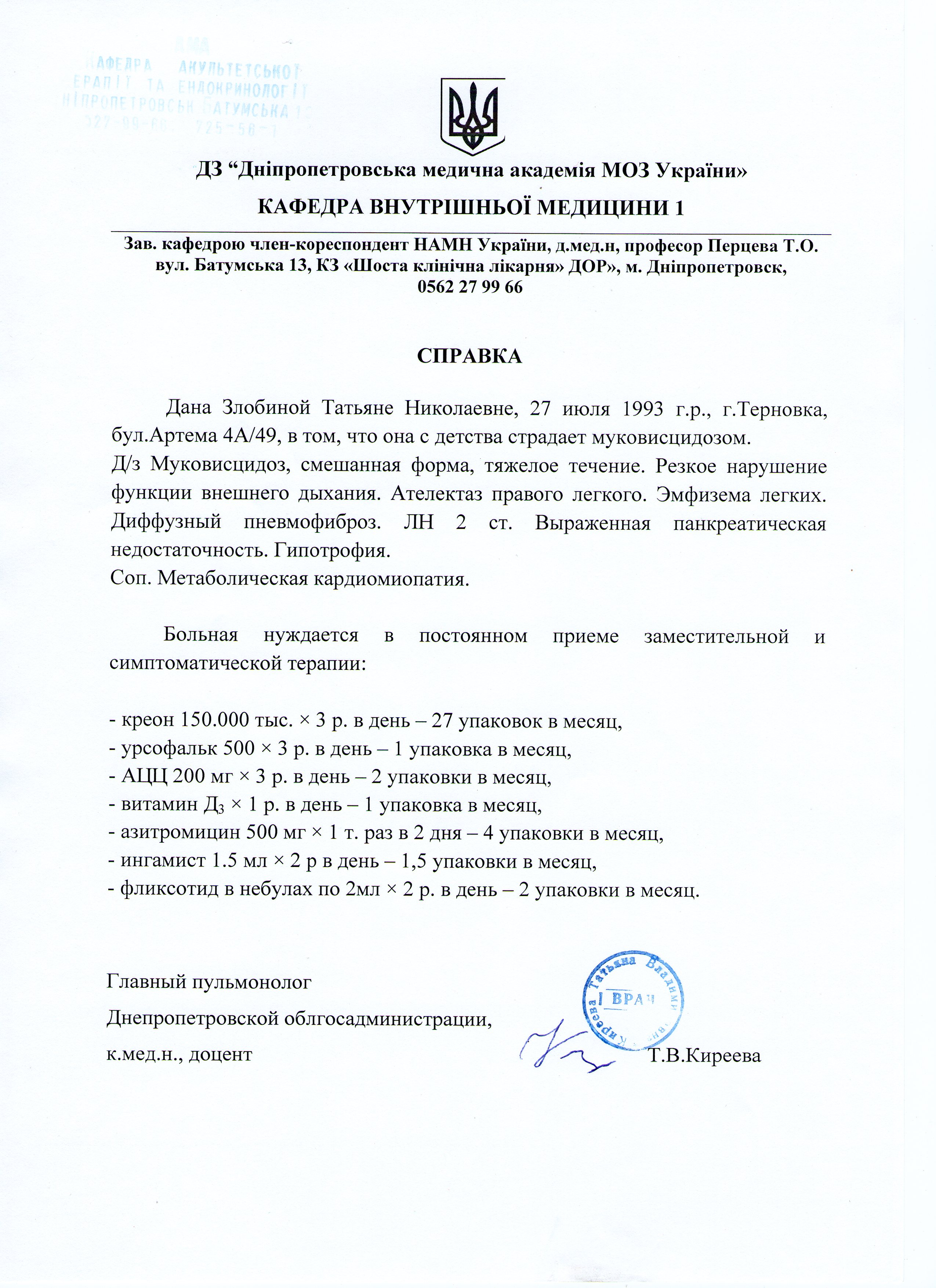 «Креон 25 000», «Урсфальк 500мг.», «АЦЦ лонг 600мг.», « пульмобриз» , витамины «Кальций Д3», «Азитромицин - 500 мг.», «Викасол - 15 мг.», «Серетид: дискус - 500 мг.», « аспаркам», « йогурт или линекс», « алора». Так же необходимы ингаляции через небулайзер 2 раза в день по схеме: «беродуал», «лазолван», ингамист», « фликсотид». И антибиотики внутривенно курсами и при обострении: «ципрофлоксацин», «возапро», «лазолекс», «реосорбилакт».