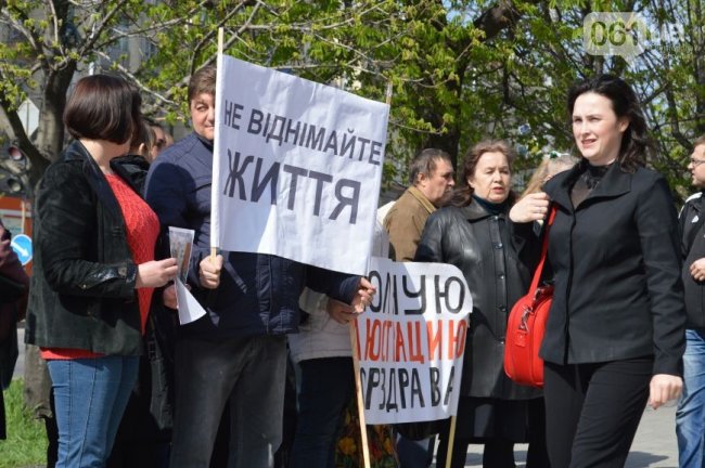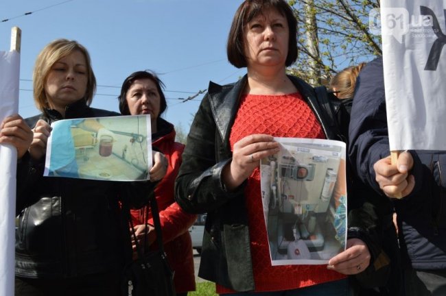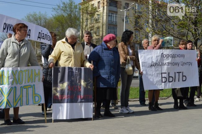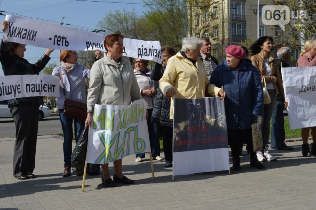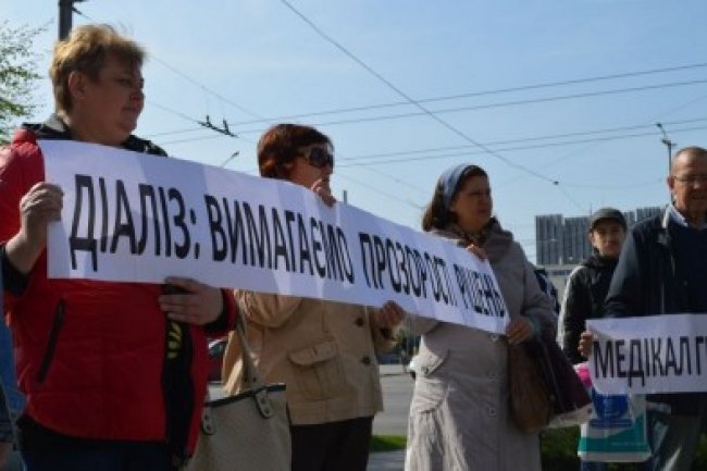 В руках люди держали плакаты с надписями "Городскому диализному центру быть", "Не віднімайте життя", "Хижаки - геть руки від діалізу", "Діаліз: вимагаємо прозорості рішень", "Мы хотим жить" и тому подобное. Активисты заявляют, что власти тайно начали завозить в медицинские учреждения города оборудование для гемодиализа плохого качества - бывшего употребления и китайской сборки. По словам пикетирующих, эти действия не были согласованы с пациентами.
