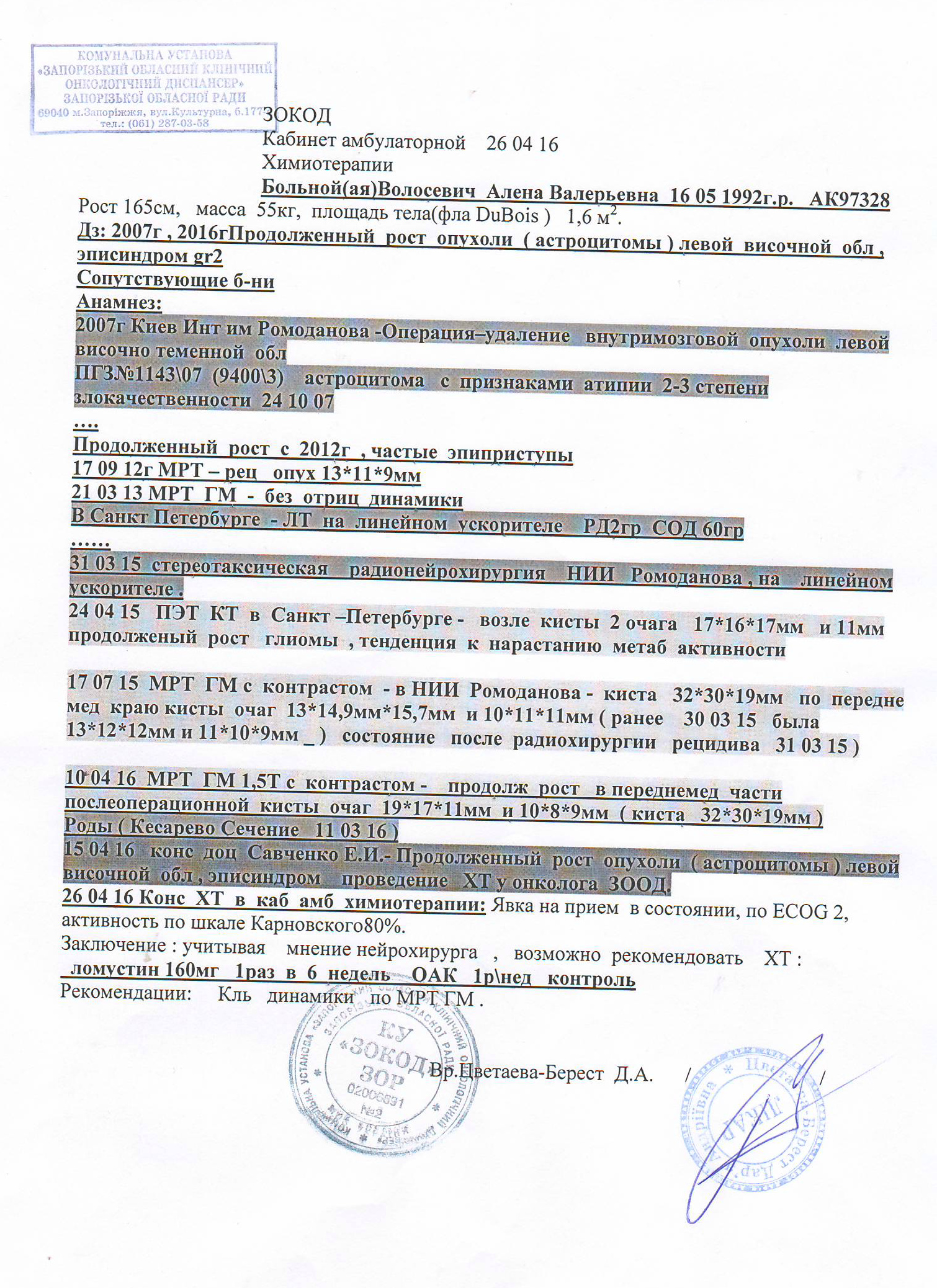 Но, после родов девушке стало хуже. Буквально в течение недели начались резкие головные боли, ежедневные приступы, потери сознания. Аленка зная, что теперь несет ответственность не только за свою жизнь, сразу обратилась к врачам, сделала МРТ головного мозга. Результаты обследования и заключения врачей – пугающие. У Алены начался резкий рост опухоли, необходимо принимать химеотерапию, иначе исход предсказуем…