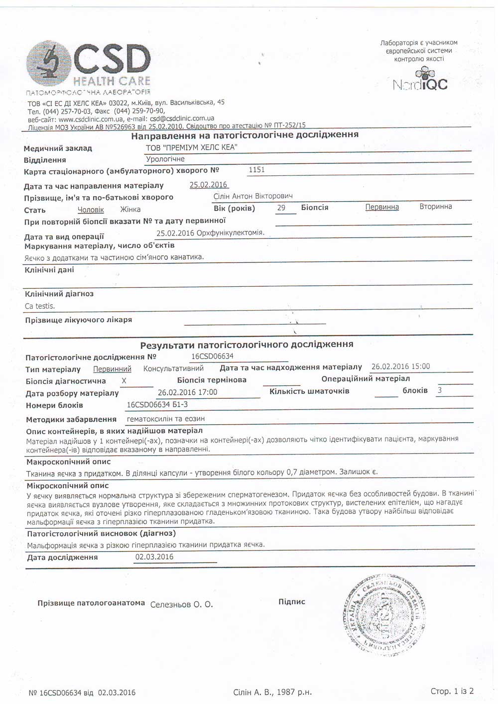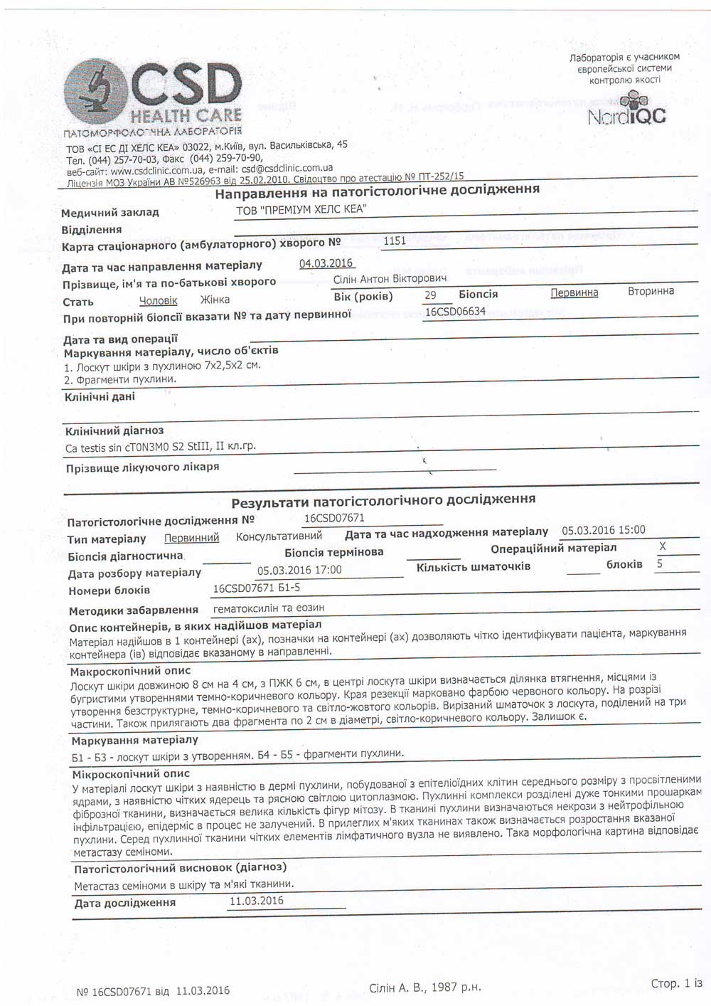 За помощью Антон обратился в киевскую клинику “Лисод”, после проведения ряда анализов и повторной биопсии, врачами был вынесен вердикт о том, что опухоль переродилась в нон-семиному (семинома и эмбриональная карцинома), поэтому 4, 5, 6 химия и не помогала парню, а только наносила вред и ослабляла организм.
