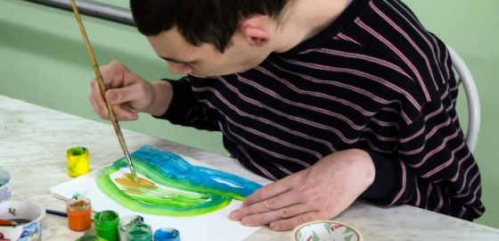 Мужчины используют цвет смелее, чем женщины: могут взять баночку с зеленой краской и вылить половину на белый лист. Так делает Женя. Он рисует весенний пейзаж с большими розовыми бабочками. Молодой человек часто подзывает к себе волонтеров и сообщает о каждой новой черточке, ему очень важно чье-то внимание. От слов «ты молодец!» или «очень красиво!» у Жени на лице появляется счастливая улыбка, и он начинает хвалить себя. За соседним столом сидят художники поскромнее: молчаливый мужчина лет сорока рисует нечто, напоминающее нож, а высокий парень собирает море из синих линий.