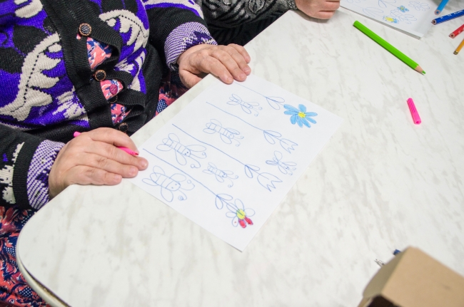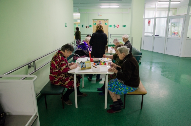 Мы с волонтерами делимся на две группы. Одна идет к бабушкам, вторая – на мужское и женское отделение. В геронтологии нам долго не открывают, и мы попадаем внутрь, только когда пациенты начинают возвращаться с прогулки. В холле бабушки смотрят по телевизору фильм про войну. Мы сдвигаем столы и скамейки, чтобы удобнее было рисовать, неожиданно раздается крик: «Сломали! Починила, а вы сломали!» Кричит Галя: она носит очки с сантиметровыми линзами, из-за этих луп ее глаза кажутся расплывшимися серыми кругами. Бабушки пытаются ей объяснить, что скамейки никто не ломал, но она не сдается. В результате нам приходится нести их из другого зала.